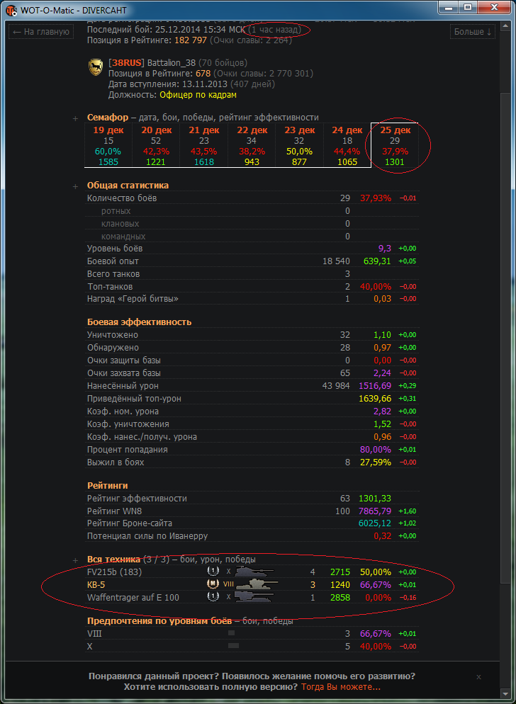 Привет Юрий. Сейчас проверил статистику моего друга, тут же заметил не соответствие времени последнего боя, на часах 21.25 а в программе 21.45, т.е +20 минут. Это как может быть ? Зашел специально в ангар игры посмотреть, а там последний бой этого игрока 20.45. Видимо у тебя программа на зимнее время не перешла (на час назад) http://cdn-frm-eu.wargaming.net/wot/ru/uploads/monthly_10_2014/post-3051972-0-70711700-1414693878_thumb.png- 3 065 ответов