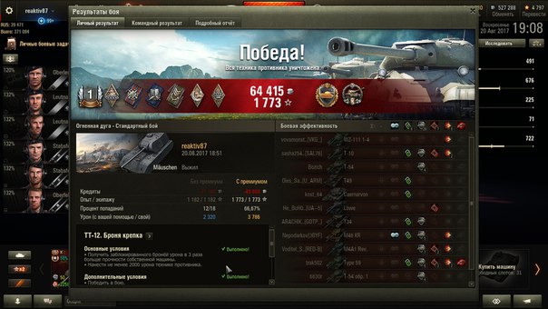 ТТ12. На вк100 никак не выходило. Как купил мышонка сразу получилось. Условия?) открытая карта без арты. Отсутствие фугасных монстров и немного неумных врагов. Танканул 8600. 1500 потерял. Накидал 3600. По факту даже тт15 выполнил. http://cdn-frm-eu.wargaming.net/wot/ru/uploads/monthly_08_2017/post-30524148-0-23610200-1503291011_thumb.jpg