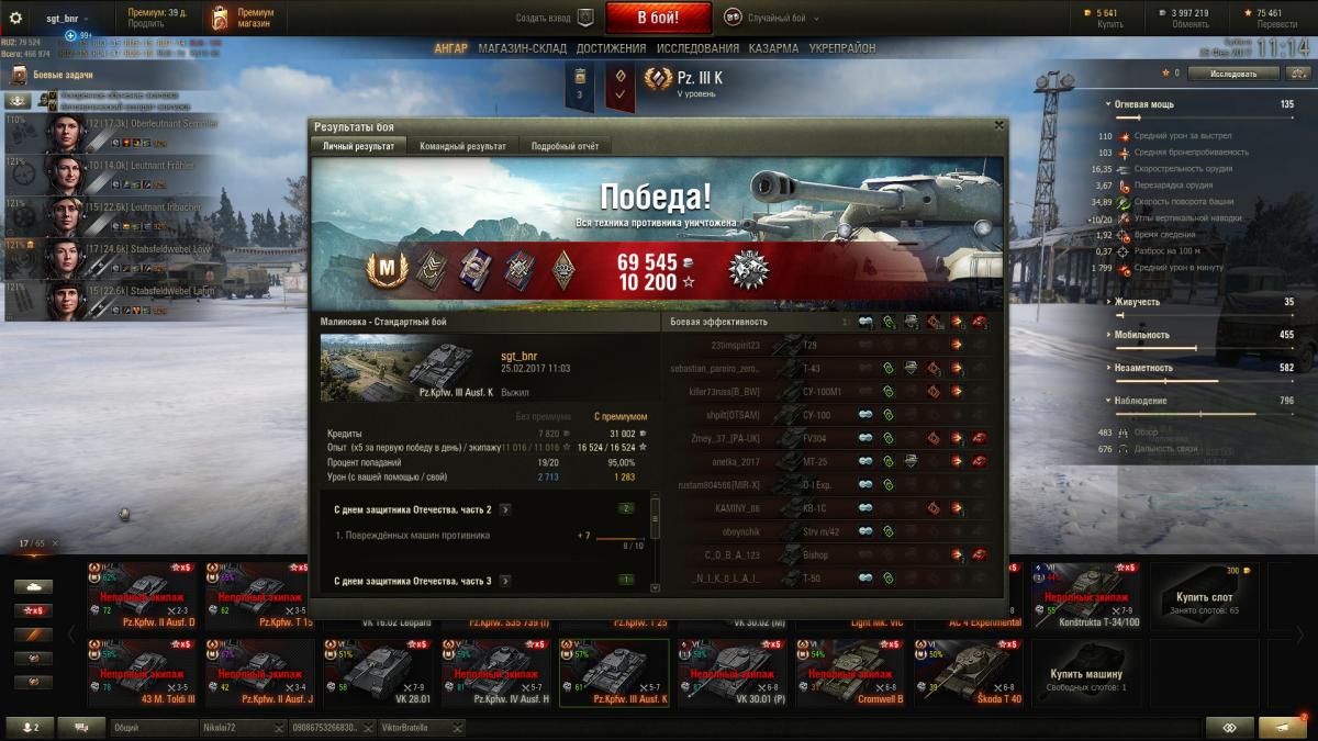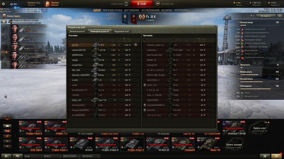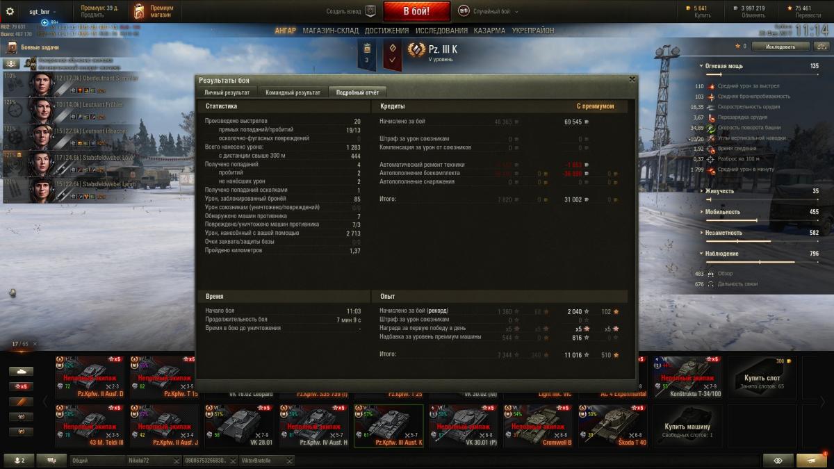 Танк для мазохистов. Если бы не шел внагрузку к Скорпу, никогда бы его не встретил. Использую только для перекачки экипажей немецких СТ при пересадке. Ну или снять х5 В низкой скорости и мощности есть свои нежданные плюсы - приходится ПТшить, к БК бы еще снарядов 20. Танк это не улучшит, но хоть пострелять можно, как на стоковом Штуге с улучшенным обзором и башней. Статистику не вел, но по ощущениям его редко кидает к 7 лвл, чаще 5-6, что для него тоже напряг. Нужен уровень боев не выше 5го Но раз в год в руках стреляет и палка: попал на Малиновку с пятью семерками на команду, было желание поехать на автопилоте через поле, но удержался, в итоге: Победа, 1360 чистого урона, 2713 засвета, 1283 настрела, Дозорный, Мастер. Реплей: http://wotreplays.ru/site/9725873#malinovka-sgt_bnr-pz_kpfw_iii_ausf_k скрины: http://cdn-frm-eu.wargaming.net/wot/ru/uploads/monthly_02_2017/post-3100731-0-02828300-1488011411_thumb.jpghttp://cdn-frm-eu.wargaming.net/wot/ru/uploads/monthly_02_2017/post-3100731-0-89166700-1488011426_thumb.jpghttp://cdn-frm-eu.wargaming.net/wot/ru/uploads/monthly_02_2017/post-3100731-0-09186100-1488011440_thumb.jpg Дайте танку льготный уровень боев!!!