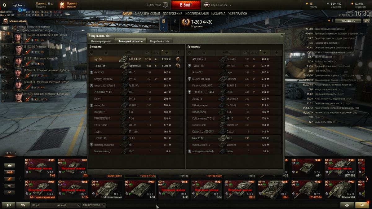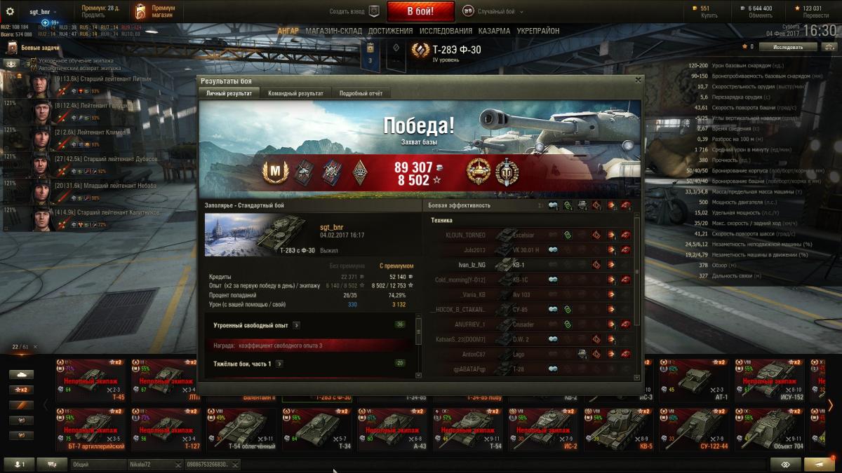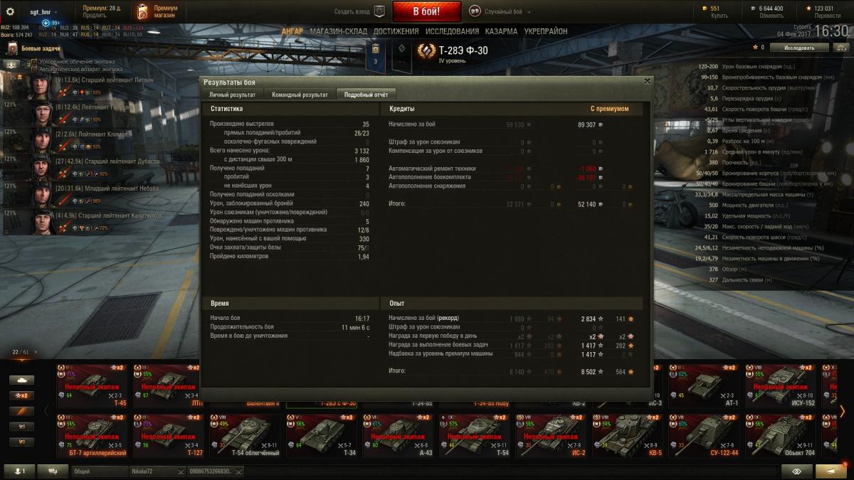 Всхвастну: 3132 урона, 1 889 чистого опыта. Остальная часть команды нанесла менбше урона - 2 939 http://wotreplays.ru/site/9616682#zapolyar_e-sgt_bnr-t-28e_s_f-30 ПОБЕДА!Т-28Э Ф-30ЗаполярьеОпыт за бой: 8 502 (x2)Опыт экипажу: 12 753Кредиты за бой: 89 307Доход за бой: 52 140 Достижения: «Костолом», «Огонь на поражение», «Дуэлянт», «Основной калибр», «Воин», Знак классности «Мастер» Ничего сверхестественного не делал, но тир получился знатный! http://cdn-frm-eu.wargaming.net/wot/ru/uploads/monthly_02_2017/post-3100731-0-40653800-1486215984_thumb.jpghttp://cdn-frm-eu.wargaming.net/wot/ru/uploads/monthly_02_2017/post-3100731-0-61579400-1486215996_thumb.jpghttp://cdn-frm-eu.wargaming.net/wot/ru/uploads/monthly_02_2017/post-3100731-0-14269200-1486216007_thumb.jpg