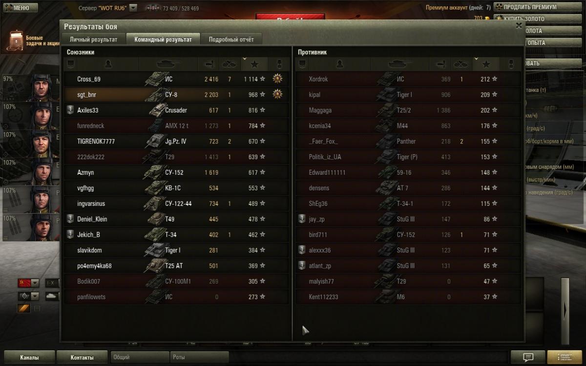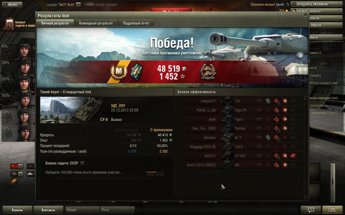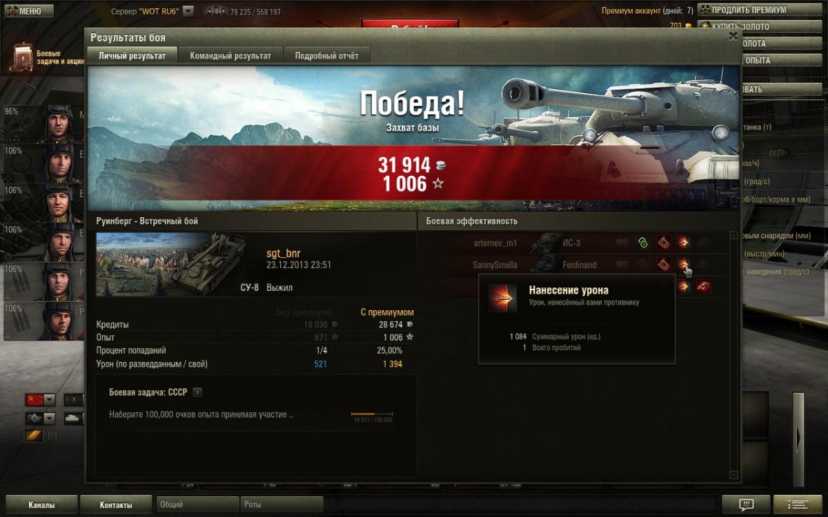 СУ-8 сегодня порадовала, в одном бою обидел Федора на 1084 с горением, в следующем (62-ом) бою взял "мастера", причем без подвигов - постоял, пострелял, сваншотил СУ-152, которая не светилась :) Мастер получился не тяжеловесный - 968 чистого опыта. На СУ-8 до 8.6 не играл, поэтому вайна по поводу нерфа не подымаю. Но точность пока грешит, может кач экипажа поможет