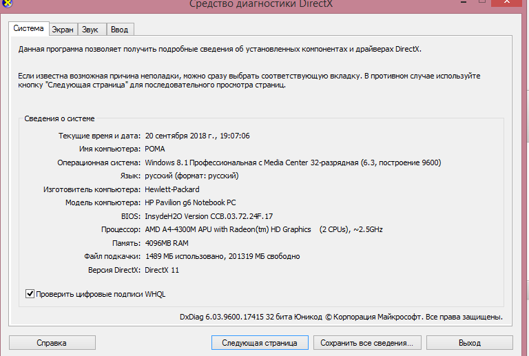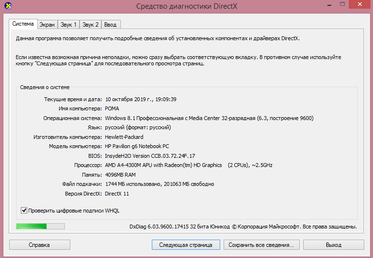 Привет кто читает ,суть такова : Сегодня зашел в гейм центр, пишет что надо обновление скачать, скачивание началось , но до конца не закачалось , остановилось на "12.95 мб ост. загрузить" , пробовал перезагрузить гейм центр , когда он включался то на 1-2 сек можно было заметить что пишет мол восстановите файлы игры , и надпись эта пропадает, заменяется продолжением скачивания, которое на одном месте так и застряло. Ну думаю тогда переустановлю всю игру, что и было сделано . Через время подхожу к ноуту и вижу : Установка / 12.95 мб ост. загрузить и на этом уже час так и осталось. Подскажите что делать? ноутбук hp pavilion g6 2201sr (C4W09EA) , скрины из dxdiag прилагаю, и свойства компьютера, драйвера проверил на устаревшие - все новые