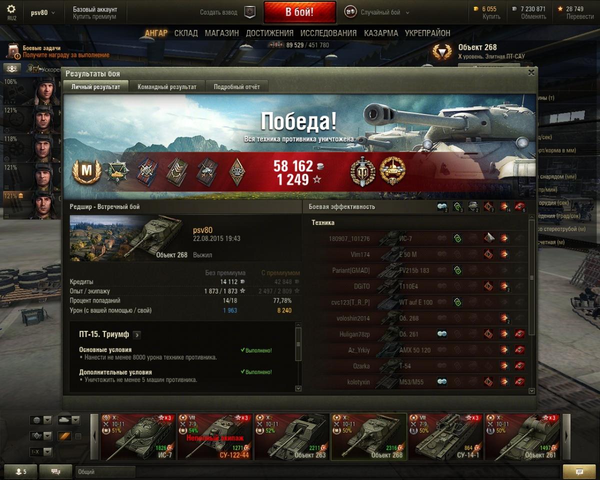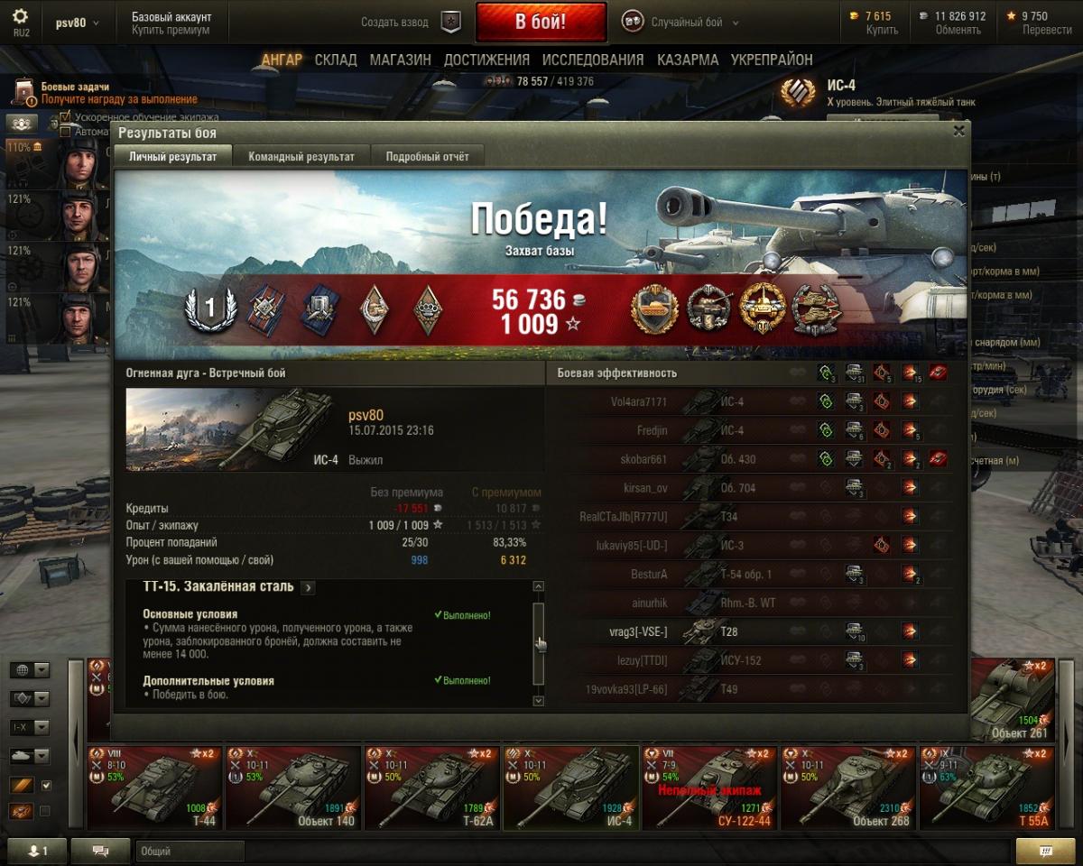 http://cdn-frm-eu.wargaming.net/wot/ru/uploads/monthly_07_2015/post-3209611-0-13960000-1437059732_thumb.jpghttp://cdn-frm-eu.wargaming.net/wot/ru/uploads/monthly_07_2015/post-3209611-0-87677500-1437059740_thumb.jpg ТТ-15 выполнена. ИС-4 не подвел. Остались две самые упоротые задачи: СТ-15 и ПТ-15