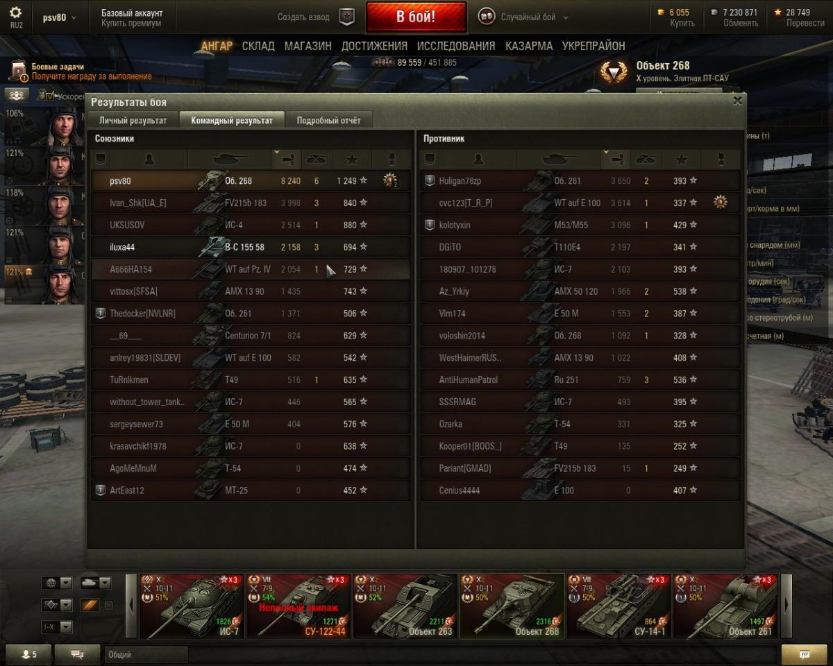 Подавляющее большинство, как мне кажется делают на вафле100. Мне же удалось на 268, но опять же при благоприятном стечении обстоятельств: вовремя слились союзники, а последний из них (на арте), после моей просьбы, дал добить оставшуюся арту противника. Этого как раз хватило на 6 фрагов и 8240 урона.