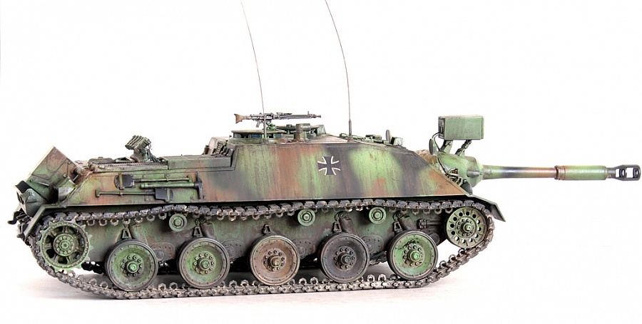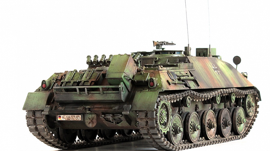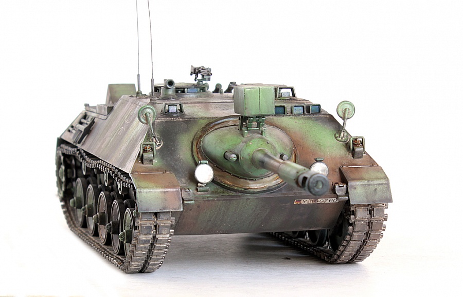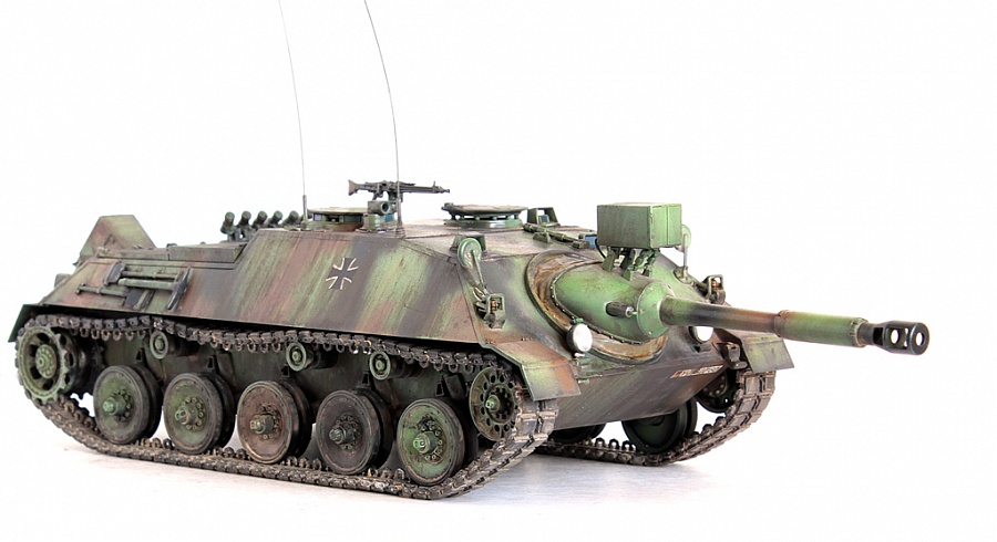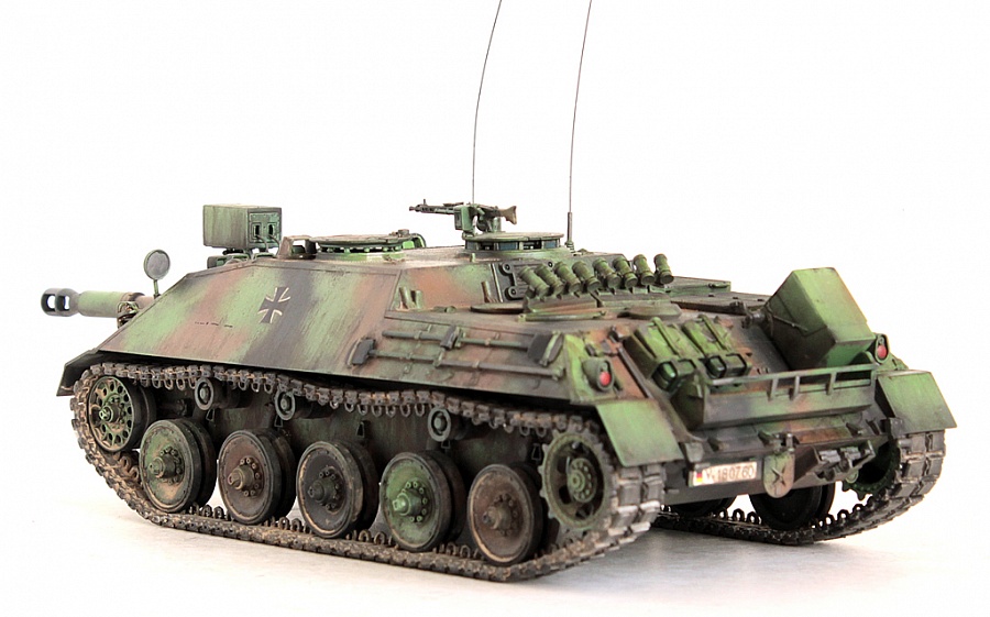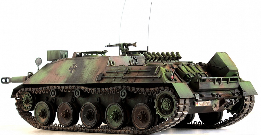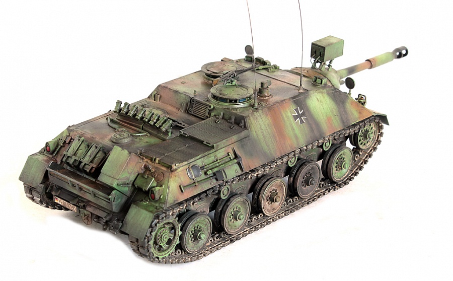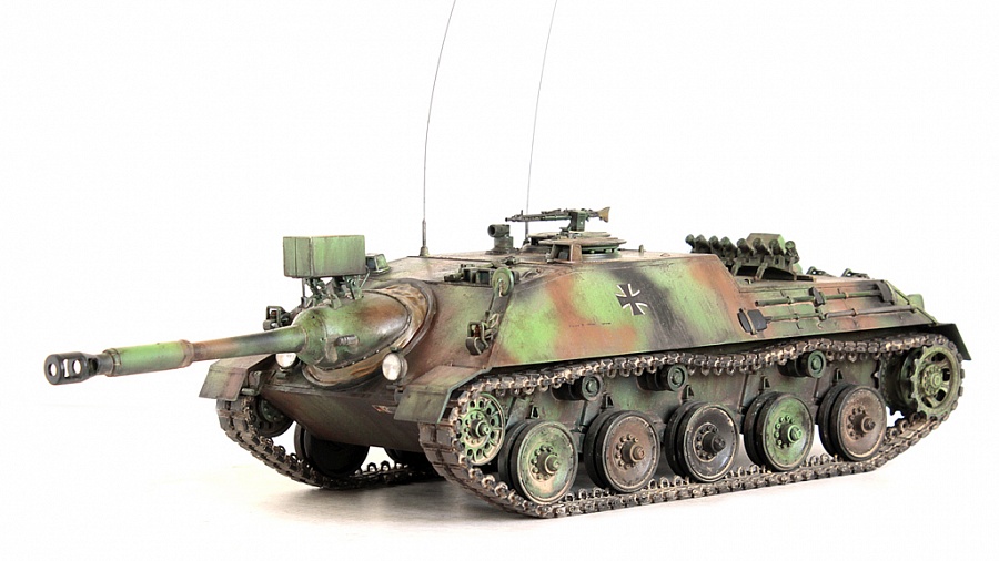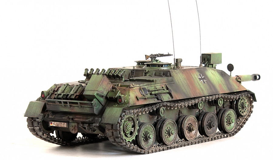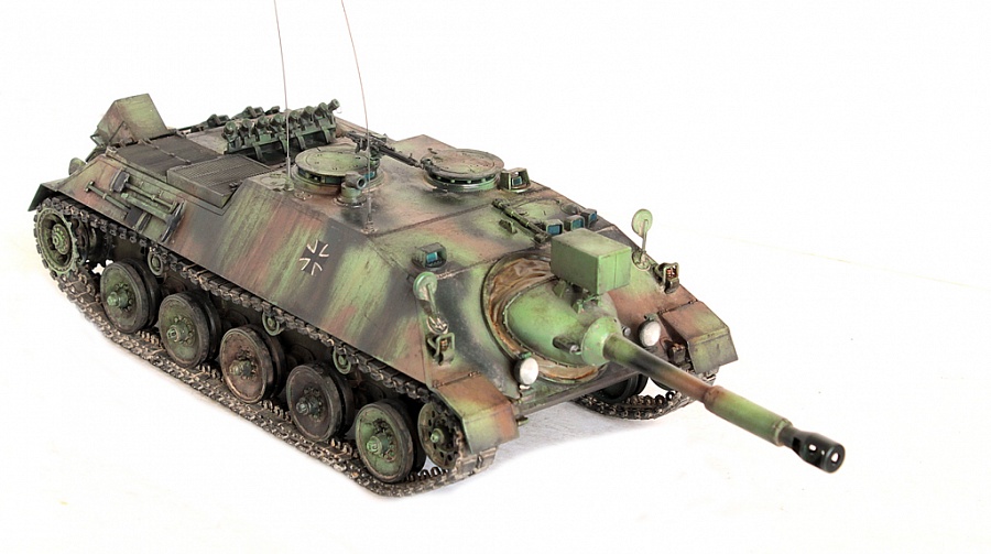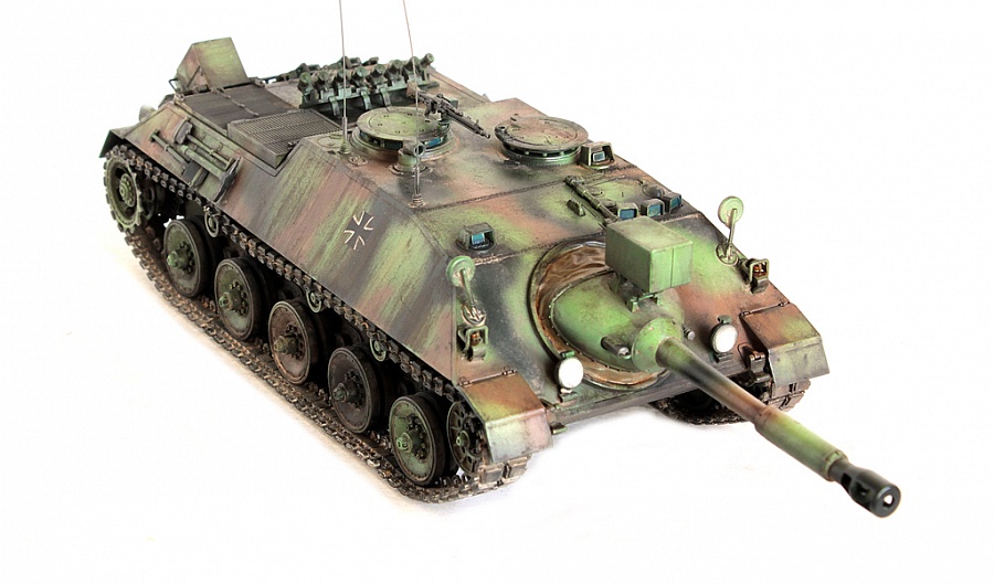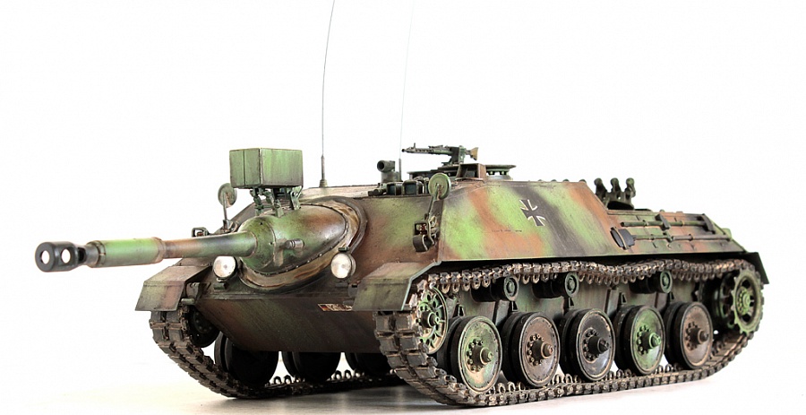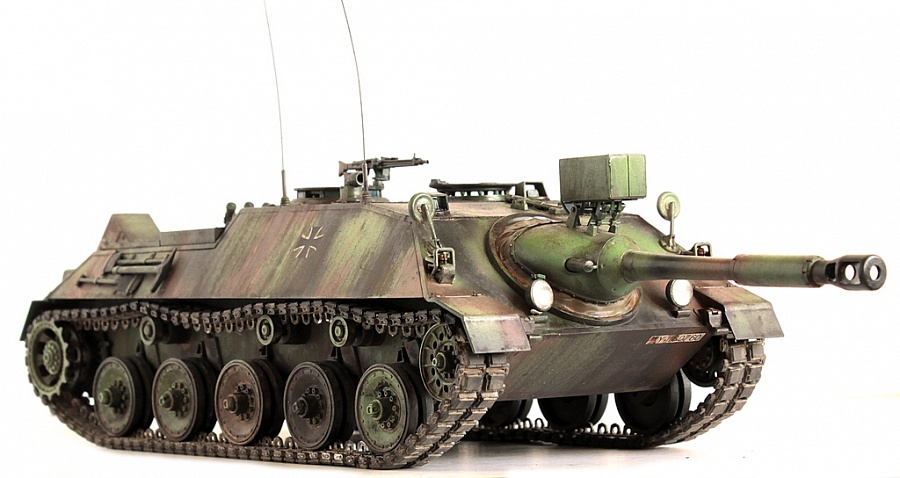 Доброго времени суток, друзья!Представляю свою крайнюю работу от Revell - Kanonenjagerpanzer (Kajapa). За довольно внушительный стаж в моделизме, это мой первый опыт сборки от данного производителя.Ревелл, на сколько я понял, это такой наш "Огонёк" в вперемежку со Скифом. Пластик душераздирающего изумрудного цвета, в утяжинах всё, вообще всё! На удивление, к этим дровам есть афтемаркет, который хоть немного доводит эти дрова до приемлемого состояния, итак:- орудие от RB Models- траки, ведущие звёздочки - Фриул- дымовые гранатомёты - Мэджик Моделс.Пулемёт, шанец (частично) позаимствовал от Леопарда (Менг). Доработаны сварные швы (вернее старые сточены и нанесены новые), антенные вводы из запасов с какой то НАТОвской техники. Фары - Эльф. Добавлена проводка к фарам и прожектору.В итоге получилась вполне приличная самоходка времён Холодной войны. Смотрится очень "дерзко", надеюсь в будущем китайские товарищи обратят внимание на этот интересный но пока что безальтернативный аппарат.