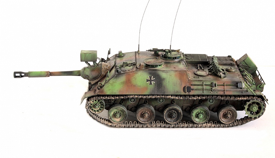 Доброго времени суток, друзья!Ввиду большего количества свободного времени, решил почистить запасы и собрал данный аппарат от Тамии, датированный ещё 1995 г.Набор - классическая Тамия - неплохая заготовка под модель. Всё по классике - резиновые траки, ни какой оптики, ни какого травления. Как говорится "бедненько, но чистенько".Из дополнений были использованы:- наборные траки от Мастерклаб.- три набора траления от Мира Моделей: Щиток пулемёта с креплениями, надмоторные сетки и кормовая корзина.добавлена проводка к дымовым гранатомётам, трос - металлический, шанец из разных наборов Драгона.Попытался изобразить "уставшую" повоевавшую самоходку. В планах так же заказать барахлишко от Блэк Дог на корму.. пока в поисках нужного...На фотографии заметил эффект перекоса дополнительной брони... а на модели всё идеально... Приятного просмотра!