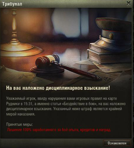 1. http://cdn-frm-eu.wargaming.net/wot/ru/uploads/monthly_01_2015/post-3228395-0-75304600-1421150980_thumb.jpg На меня было наложено дисциплинарное взыскание, за бездействие в бою. Но это зависит не от меня, как быть? Я, запускаю игру и начинается, то связь с сервером потеряна, то fps 1 ping 999. И кто же в этом случае должен быть наказан, по моему это не справедливо.