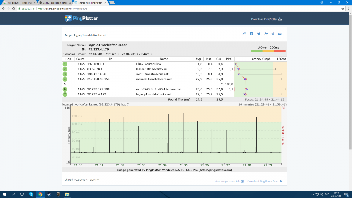 Всем доброго времени суток. Создал тему потому что уже просто исчерпал все что знаю, либо все что нашел. Проблема возникла после того как умерла материнка. Купил новую. Все собрал запустил установил винду дрова и тд и тп. Все работает. Интернет игры и тд. НО - играть в онлайн игры больше никак. постоянный обрыв с сервером. Сначала думал дело в винде, переустанавливал аж 3 раза с разных ресурсов (вин10). Грешил на роутер, сбрасывали перенастраивали. Потом на кабель, тоже нет, брал системник возил к товарищу на его роутере и кабеле все тоже самое. Долго ковырялся в брандмауэре и тд, в итоге просто отключил все что может мешать. антивирусами не пользуюсь. родные виндовские все отключил. Решил что сетевуха материнская фигу кажет, купил сетевую карту, вставил, НЕТ. Все тоже самое. Причем первые 2 дня в игру вобще не пускало, сразу обрыв и все, максимум получалось зайти в ангар на 5-10 сек. потом появились какие-то сподвижки, стало пускать, и на долго, ночью получилось даже поиграть час без вылетов, но при этом пинг показывал 999, круто, 999 но игралось как при 20-50. То есть цифры то пинга 999 но лишь как говорится на картинке, по факту никакого пинга нет. С проблемой воюю 5й день. Ради интереса загрузил PUBG, такаяже фигня. Сервер нафиг. Браузер все остальное работает исправно, сайты, фильмы онлайн и прочее. Оперативку тестил виндой, пишет проблем не обнаружено. АИДА64 CPU_Z все показывает в норме, стрес тесты все проходит. что делать..... https://share.pingplotter.com/FytyoK9poDq - это тестил когда получалось немного поиграть. WoT_report.wgc