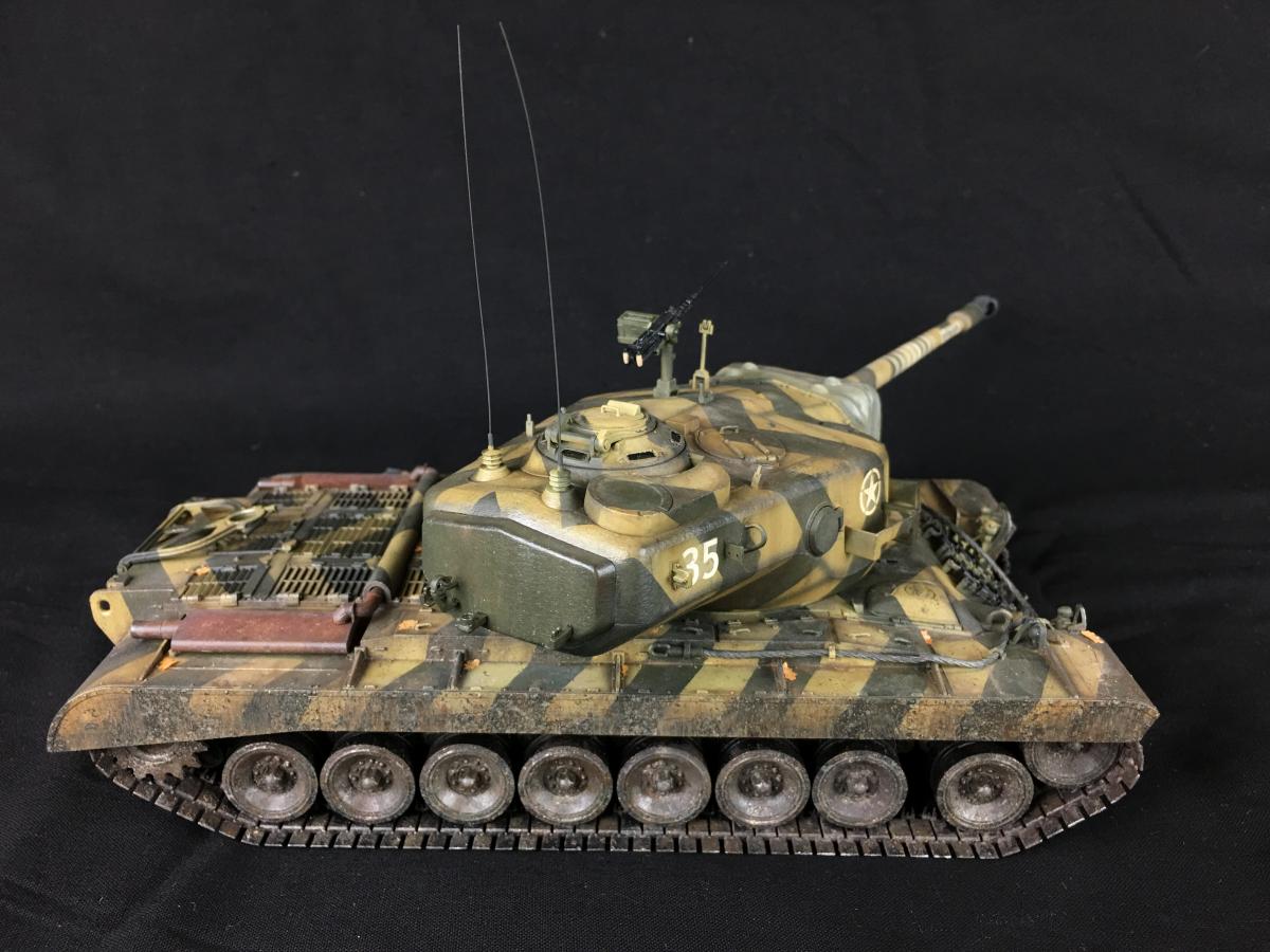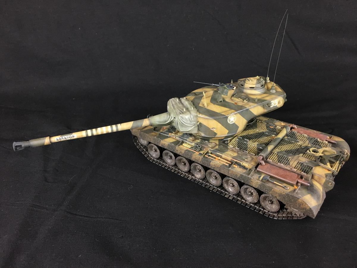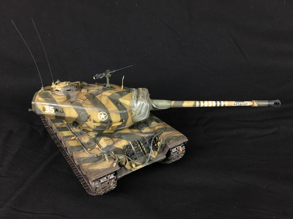 Американский тяжелый танк T34 в масштабе 1/35 от Takom Интересная машина конца 1945 года, которой так и не довелось попасть в серию, а тем более побывать в военных конфликтах. Однако внешний вид, возможности этой огромной машины вызывают восхищение. Для многих Т34 – это один из мощнейших тяжелых танков середины сороковых годов, который, хоть и не получил возможность проявить себя, однако показал то, какие мощные машины способны создать инженеры. Т34 окрашен в двухцветный ломано-полосатый камуфляж, идущий поперек танка. Цвета камуфляжа: темно-желтый и оливковый (темный). Локально выполнены высветления обоих цветов, а с помощью полупрозрачного темного лака выполнена техника «пост-шейдинг» по граням модели и углубленным местам. Масляными красками затонирован камуфляж и локально выполнена растушевка маслом, чтобы разнообразить оттенки камуфляжа. С помощью масляных смесей выполнено загрязнение, которому уделено особое внимание. Восприятие формируется от проработки мелких деталей, поэтому грязь нанесена в несколько слоев – несколько раз были нанесены различные оттенки и сделаны капли и брызги. Сделан эффект потеков грязи и дождевых потеков путем вертикальной растушевки. Несколько осенних листьев, прилипших к гусеницам, верхней части корпуса и башне – также очень приятная мелочь. Потертость грунтозацепов выделена стальным пигментом. Огромные глушители покрыты пигментами, которые имитируют ржавчину от темно-коричневого до светло-желтого цветов. Кроме этого, на концы выхлопных труб и на места под ними нанесена копоть, а также глянцевая смесь, которая играет роль неотработанного топлива. Дульный тормоз орудия закопчен. На решетки МТО в углубления обильно нанесена черная смывка, дабы подчеркнуть рельеф. Отдельного внимания заслуживает брезентовый чехол на маске орудия. Вид текстуры брезенту придает сложная окраска выделяющая плетение полотна. В углублениях основной цвет затемнен, а на выступающих площадях – высветлен. Декалями на борта башни нанесены американские опознавательные знаки – белые звезды в кругу, а также надпись «ABBADON» с обеих сторон ствола орудия. Победные полосы на стволе орудия нарисованы аэрографом. Габариты модели (длина | ширина | высота): 337 мм | 107 мм | 92 мм