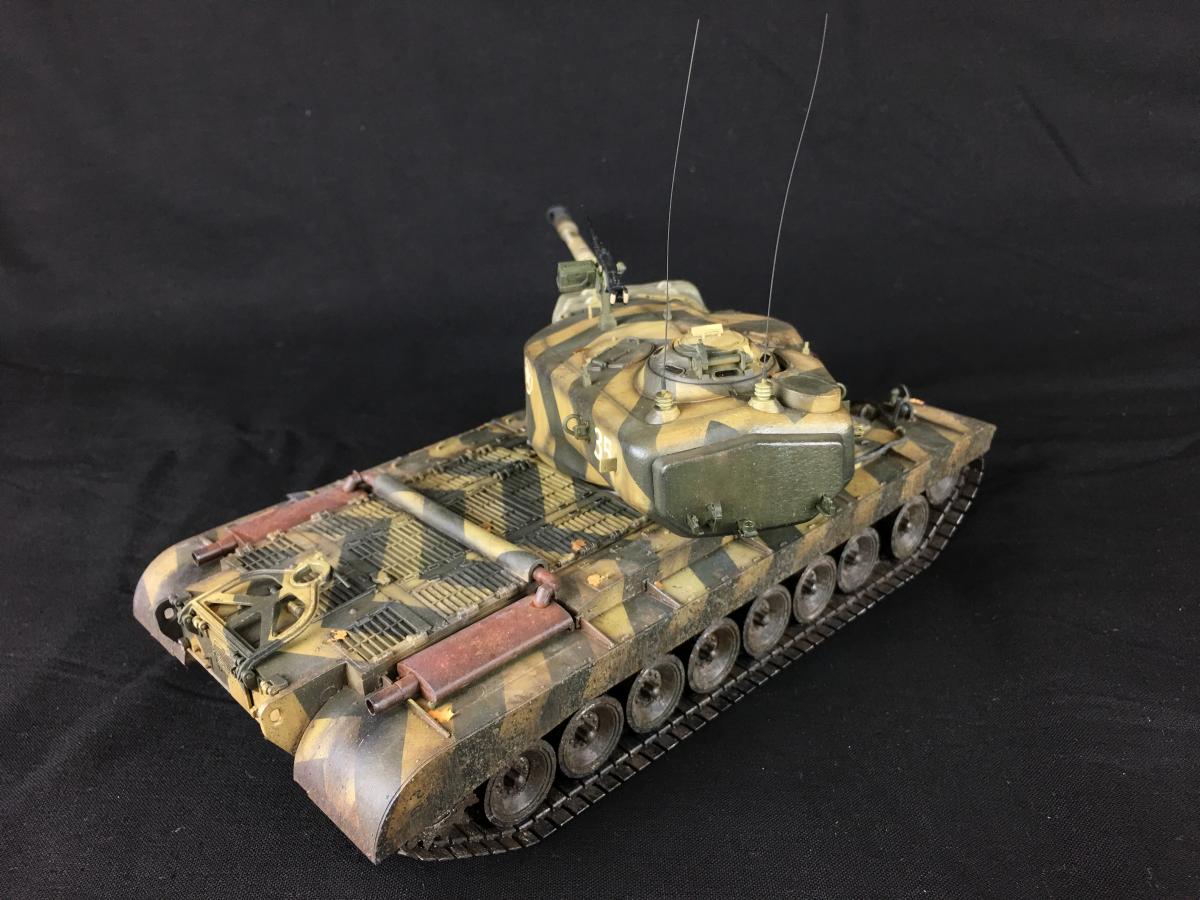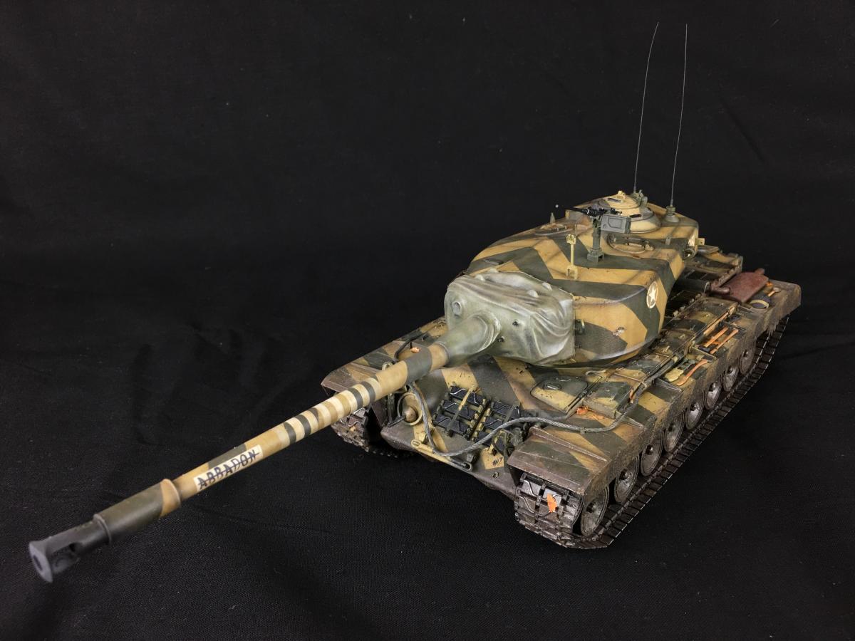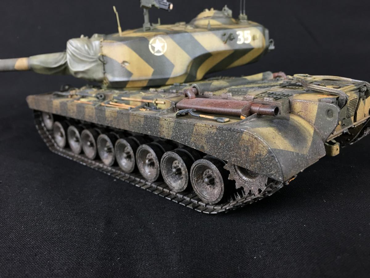 Американский тяжелый танк T34 в масштабе 1/35 от Takom Интересная машина конца 1945 года, которой так и не довелось попасть в серию, а тем более побывать в военных конфликтах. Однако внешний вид, возможности этой огромной машины вызывают восхищение. Для многих Т34 – это один из мощнейших тяжелых танков середины сороковых годов, который, хоть и не получил возможность проявить себя, однако показал то, какие мощные машины способны создать инженеры. Т34 окрашен в двухцветный ломано-полосатый камуфляж, идущий поперек танка. Цвета камуфляжа: темно-желтый и оливковый (темный). Локально выполнены высветления обоих цветов, а с помощью полупрозрачного темного лака выполнена техника «пост-шейдинг» по граням модели и углубленным местам. Масляными красками затонирован камуфляж и локально выполнена растушевка маслом, чтобы разнообразить оттенки камуфляжа. С помощью масляных смесей выполнено загрязнение, которому уделено особое внимание. Восприятие формируется от проработки мелких деталей, поэтому грязь нанесена в несколько слоев – несколько раз были нанесены различные оттенки и сделаны капли и брызги. Сделан эффект потеков грязи и дождевых потеков путем вертикальной растушевки. Несколько осенних листьев, прилипших к гусеницам, верхней части корпуса и башне – также очень приятная мелочь. Потертость грунтозацепов выделена стальным пигментом. Огромные глушители покрыты пигментами, которые имитируют ржавчину от темно-коричневого до светло-желтого цветов. Кроме этого, на концы выхлопных труб и на места под ними нанесена копоть, а также глянцевая смесь, которая играет роль неотработанного топлива. Дульный тормоз орудия закопчен. На решетки МТО в углубления обильно нанесена черная смывка, дабы подчеркнуть рельеф. Отдельного внимания заслуживает брезентовый чехол на маске орудия. Вид текстуры брезенту придает сложная окраска выделяющая плетение полотна. В углублениях основной цвет затемнен, а на выступающих площадях – высветлен. Декалями на борта башни нанесены американские опознавательные знаки – белые звезды в кругу, а также надпись «ABBADON» с обеих сторон ствола орудия. Победные полосы на стволе орудия нарисованы аэрографом. Габариты модели (длина | ширина | высота): 337 мм | 107 мм | 92 мм
