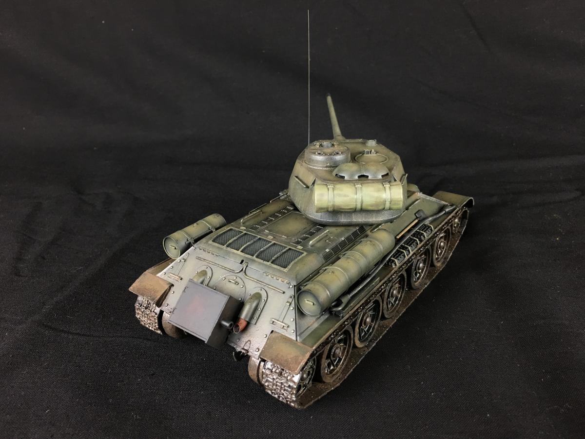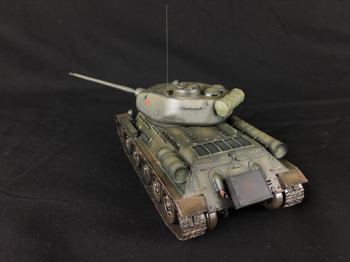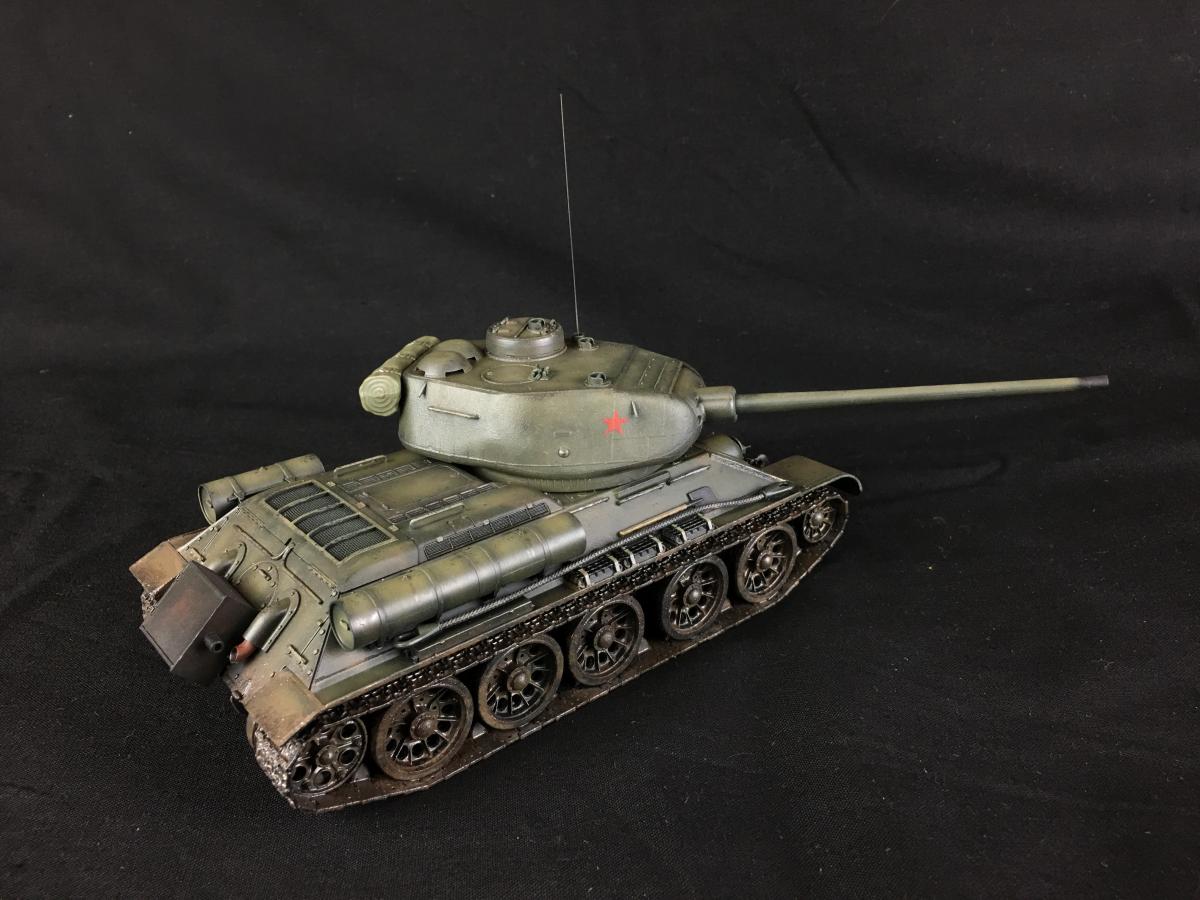 Масштабная модель легендарного советского среднего танка Т-34/85 в масштабе 1/35 Модель окрашена в стандартный темно-зеленый защитный цвет с выполнением техник цветомодуляции аэрографом и прешейдинга. Обе техники позволяют выделить грани танка, освещенные и затемненные зоны, что делает танк объемнее, а монотонному камуфляжу придать больше оттенков для богатства палитры. Мелкие выступающие детали выделены кисточкой более светлым, чем цвет камуфляжа, оттенком зеленого цвета. Этот прием помогает выделять грани и делать акцент на маленьких деталях, которые без этой техники терялись бы на фоне всей модели. Гусеничные ленты сделаны из пластика. Все элементы оптики и фара сделаны из прозрачного пластика. Антенна на танке представляет из себя легко гнущийся и недеформирующийся материал. При этом антенна очень тонкая и не переразмеренная. Опознавательные знаки – звезды на бортах башни, выведенные тонкой кистью. Танк не имеет бортовых номеров, а соответственно не привязан ни к какому прототипу и является собирательным образом танка Т-34/85. Машина начала 1945 года, поэтому на танк нанесены пигменты и масляные жидкости темно-коричневых тонов под весенние водяные глиняно-земельные почвы. Модель покрыта несколькими слоям полуглянцевого лака для того, чтобы показать мокрую броню. На конец ствола орудия нанесен слой копоти, глушители покрыты слоем нагара и невыработанного топлива. Также нанесено умеренное количество сколов для того, чтобы отметить воинственность машины. Габариты модели (длина | ширина | высота): 231 мм | 86 мм | 77 мм Видеообзор: