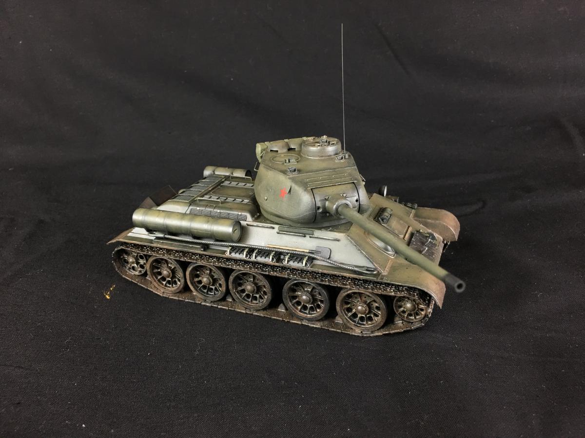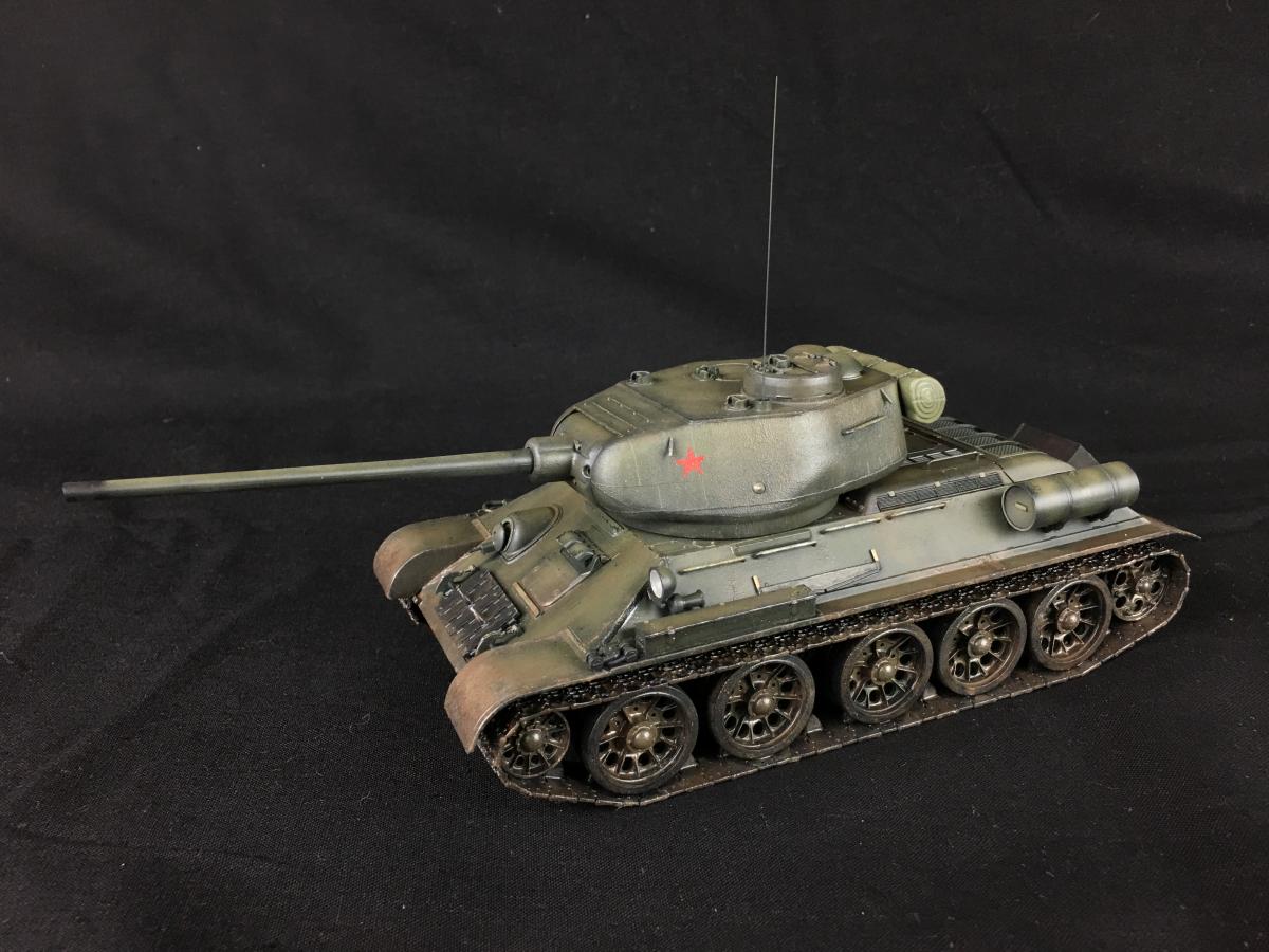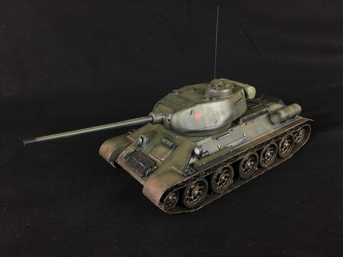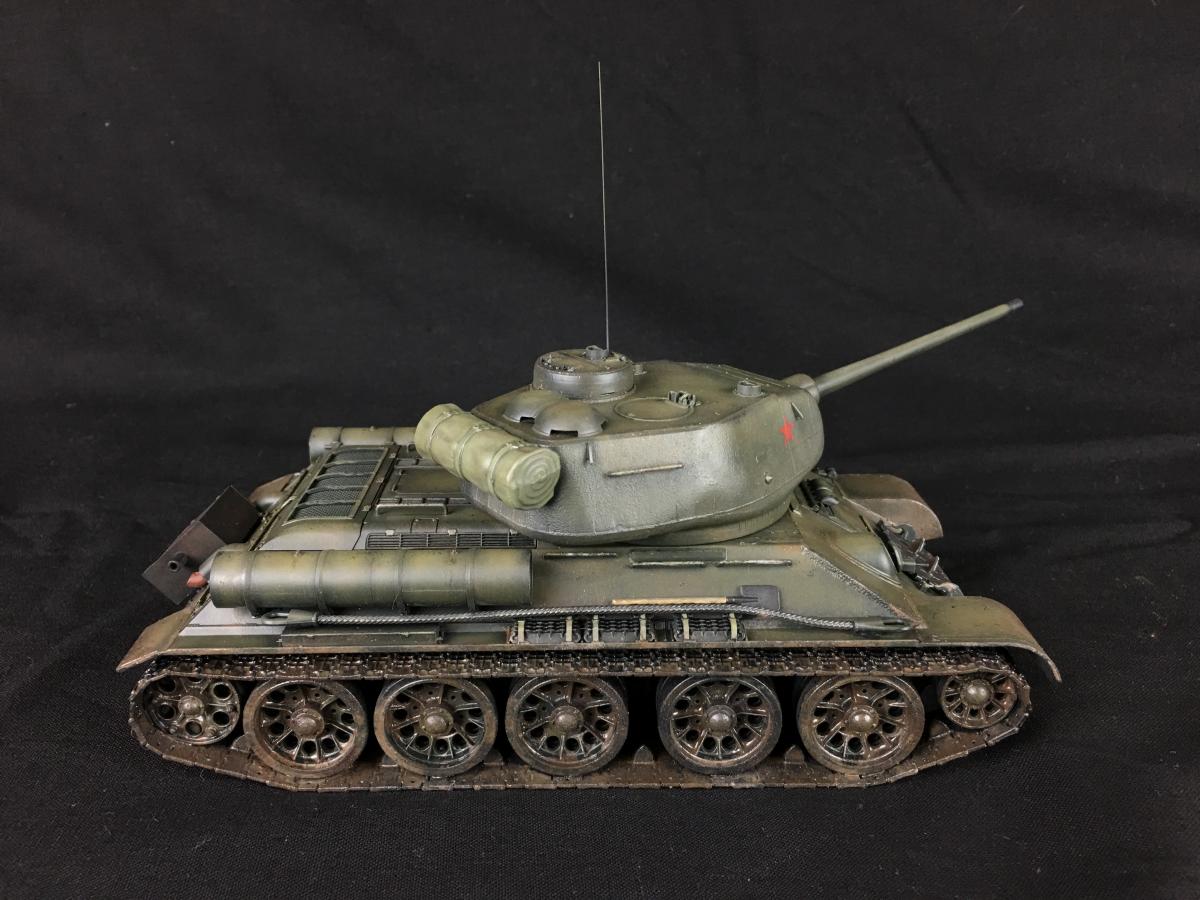 Масштабная модель легендарного советского среднего танка Т-34/85 в масштабе 1/35 Модель окрашена в стандартный темно-зеленый защитный цвет с выполнением техник цветомодуляции аэрографом и прешейдинга. Обе техники позволяют выделить грани танка, освещенные и затемненные зоны, что делает танк объемнее, а монотонному камуфляжу придать больше оттенков для богатства палитры. Мелкие выступающие детали выделены кисточкой более светлым, чем цвет камуфляжа, оттенком зеленого цвета. Этот прием помогает выделять грани и делать акцент на маленьких деталях, которые без этой техники терялись бы на фоне всей модели. Гусеничные ленты сделаны из пластика. Все элементы оптики и фара сделаны из прозрачного пластика. Антенна на танке представляет из себя легко гнущийся и недеформирующийся материал. При этом антенна очень тонкая и не переразмеренная. Опознавательные знаки – звезды на бортах башни, выведенные тонкой кистью. Танк не имеет бортовых номеров, а соответственно не привязан ни к какому прототипу и является собирательным образом танка Т-34/85. Машина начала 1945 года, поэтому на танк нанесены пигменты и масляные жидкости темно-коричневых тонов под весенние водяные глиняно-земельные почвы. Модель покрыта несколькими слоям полуглянцевого лака для того, чтобы показать мокрую броню. На конец ствола орудия нанесен слой копоти, глушители покрыты слоем нагара и невыработанного топлива. Также нанесено умеренное количество сколов для того, чтобы отметить воинственность машины. Габариты модели (длина | ширина | высота): 231 мм | 86 мм | 77 мм Видеообзор: