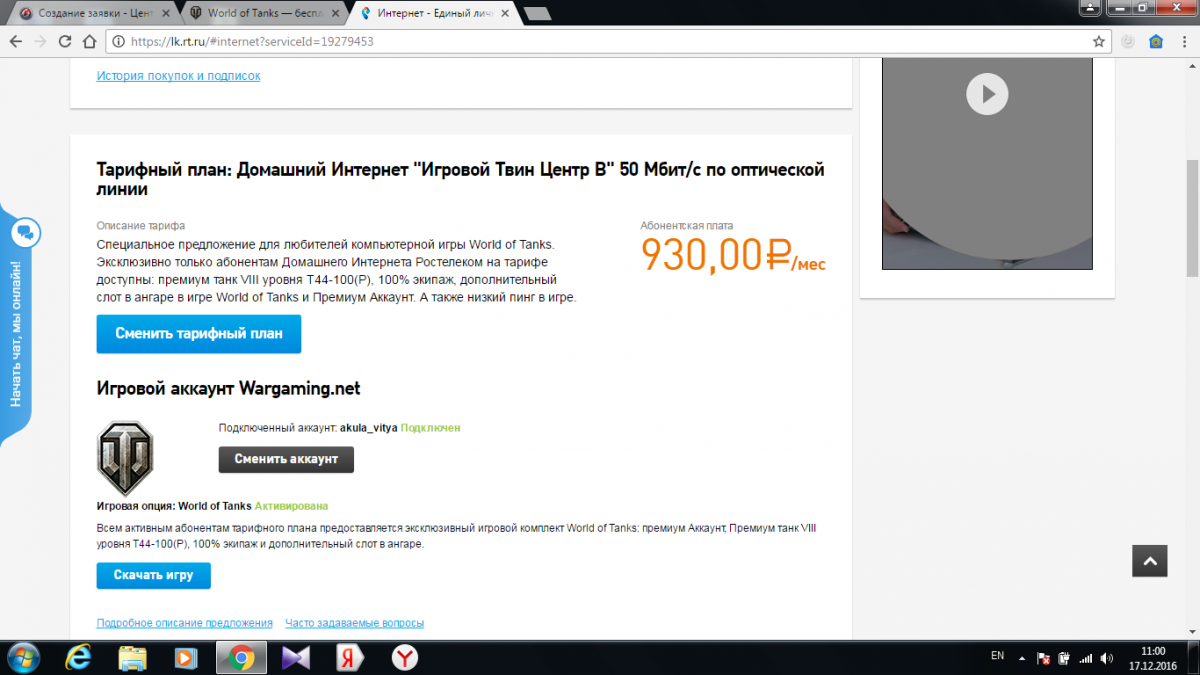 Здравствуйте, я подключен к тарифу игровой, от ростелекома. 3 месяца назад у меня пропал танк и премиум аккант идущий с ним. В ростекоме не смогли за 3 месяца решить эту проблему, пару дней назад посоветовали обратиться к вам, может вы поможете решить эту проблему. В Личном Кабинете Ростелекома, все подключено, но в ангаре танка нет.