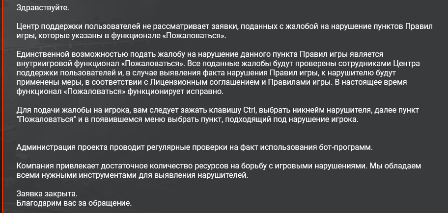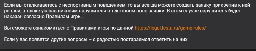 Опыт в боях и не одна сотня попыток повторения боев в игре ( не тренировочные бои - там система работает по другому, ну по крайней мере года так с 2014) "Реплеи старой версии игры не подходят и к рассмотрению браться не будут" цееее ЦЦП Кому подтвердить? Сапорту который расказывает что попадании с ФВ 215ь (183) голдовым фугасом с пробитием в 230мм попадая в корму лт Т34-2 составляющая 20 мм получаеш бзынь - вы попали в самое толстое место, стык броне листов. Через сотню боев играя на маусе было попадание в кромку лба башни, входящие во лбу 270 мм, выходное в борту башни 150 мм. Реплей был проверен и у со взводных все тоже самое. По факту снаряд прошил с торца бортовой лист брони. Героем того ролика была т 44 с пробитием в 190 мм. Сапорт рассказал что у мауса во лбу не везде 270мм но стык броне листов проигнорировали. И таких случаев обращения в сапорт сотни, где они рассказывают о каких то сверх естественных силах, где они работают в одном случаи и не работают в другом, И не по теме. А что тут вообще работает? например: Система пожаловаться? Две недели кидали репорт друг на друга за мат, при этом молчали в чат. Каждую неделю приходило оповещение о том что "Спасибо вам за подачу репортов, они были проверены, нарушители были наказаны." Разумеется банов у нас не было, пока я не подал жалобу на то что меня и еще одного игрока столкнули со скалы. Мне дали бан чата на 3 дня. мммм данон. Вывод нет никакого бота, скрипта что проверяет жалобы, пока ты не создашь репорт в ЦЦП. Да и вообще как сапорт банит за нарушения. Были связи в Топ кланах и от туда прислали забавный мод запрещенный по всем статьям. Отправил в ЦЦП с другого аккаунта, думал они разберутся и исправят чтоб больше Моды такого типа не могли использовать. Что же сделали в ЦЦП? правильно забанили мой аккаунт за распространение запрещенных модификаций. Ну или такой пример бана. Познакомился с человечком после чего вернувшись сюда, объяснив ему как куда и чем пробивать, как и куда ехать из 46% "ололораш по центру" с кпд 1000 он стал довольно не плохим игроком с 53% и кпд в 2к через две недели много часовой игры его забанили на год с формулировкой (своими словами) " нельзя за столь короткий срок и так резко стать нормальным игроком" Так до кого вы там решили достучаться? Если вместо того чтоб разобраться они раскидывают баны тем кто пытается им помочь. Дальше лучше помолчу а то и так наговорил на месячный банн