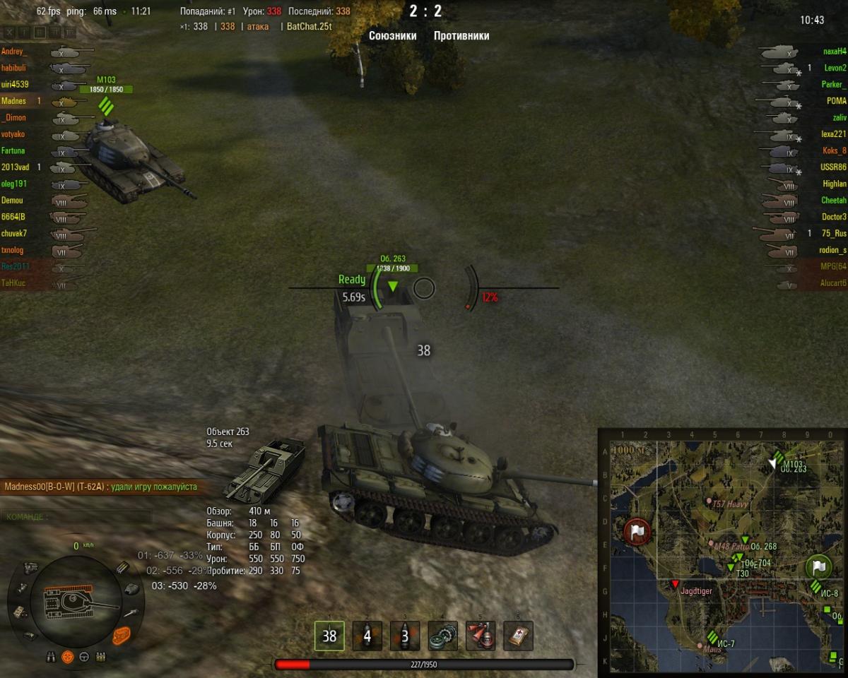 Недавно столкнулся с таким вот, мягко говоря, неприятным человеком.Бой был на карте "Фьорды", после занятия позиции в квадрате "А8" об. 263 начал меня выталкивать на незащищённую от врагов территорию, объясняя что я ему оказывается "перегораживаю обзор своим танком" :amazed: , потом он выстрелил в меня (637 урона), в ответ я зарядил фугас и убил землю рядом с ним, сплешем нанёс ему 62 урона, в следствии чего он решил что 62 больше 637 и ещё 2 раза выстрелил по мне(556, 530 урона), вытолкнул меня под арту, которая меня и убила.Подскажите, нужно ли с такими проблемами писать в саппорт, или бесполезно?Заранее спасибо. http://cdn-frm-eu.wargaming.net/wot/ru/uploads/monthly_05_2013/post-3313682-0-00190600-1369467645_thumb.jpg