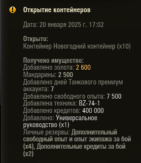 В прошлом году как раз этим десятком по скидке да из акции с карточкой весь пул забрал. Так что не надо торопиться) Однако, здравствуйте. Решил тут карточку лестовскую потестировать, - чего там по ней насыпают. В розыгрыше поучаствовать да коробок по второй скидке взять. А оно возьми да сразу после гаранта Н3 и докинь мне последний приз этой НГ акции. Впервые, наверное, за все годы в игре собрал полное бинго. Если не считать легендарных легенд, конечно. Приятнейше удивлён. Итого по деньгам что-то около 900р. на круг. Презабавно. https://forum-mt-prod.lesta.ru/monthly_01_2025/post-33914119-0-12557400-1737382166_thumb.png