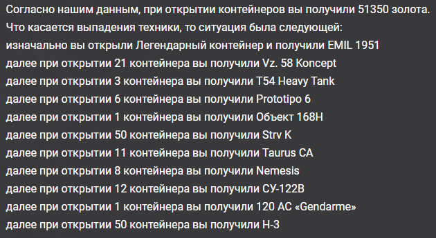 Однако, здравствуйте. Решил тут карточку лестовскую потестировать, - чего там по ней насыпают. В розыгрыше поучаствовать да коробок по второй скидке взять. А оно возьми да сразу после гаранта Н3 и докинь мне последний приз этой НГ акции. Впервые, наверное, за все годы в игре собрал полное бинго. Если не считать легендарных легенд, конечно. Приятнейше удивлён. Итого по деньгам что-то около 900р. на круг. Презабавно. https://forum-mt-prod.lesta.ru/monthly_01_2025/post-33914119-0-12557400-1737382166_thumb.png