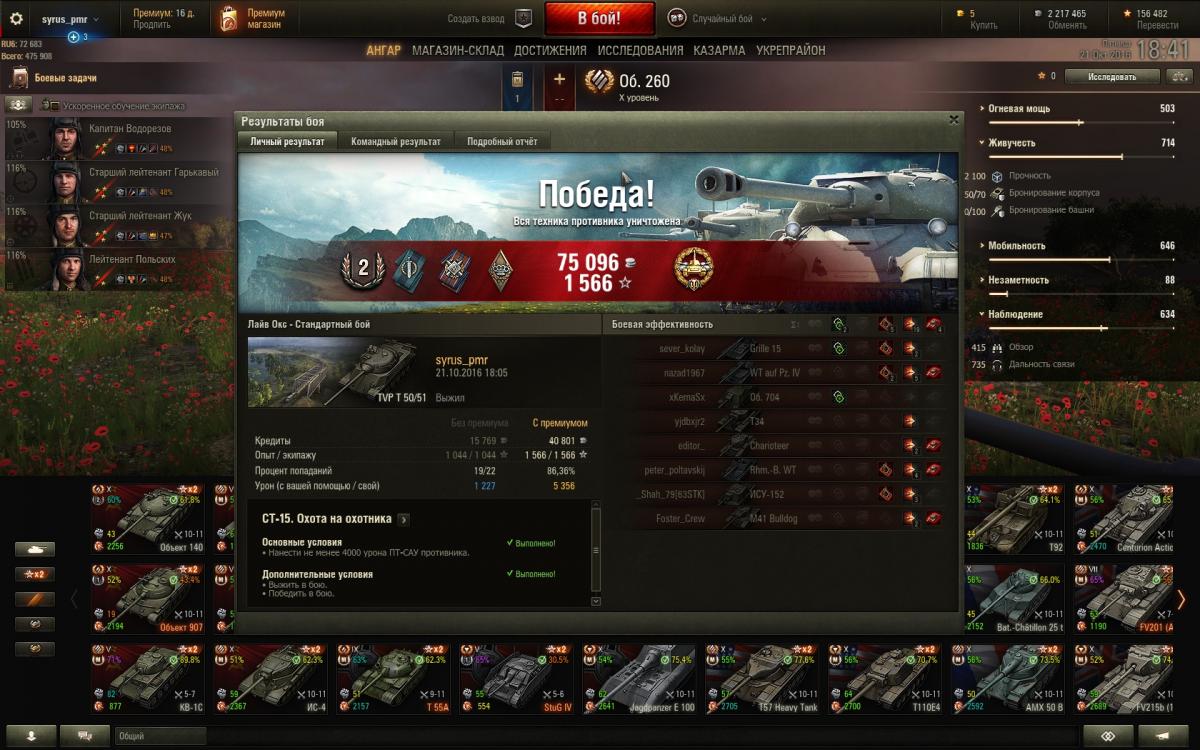 Наконец-то!!!ЛБЗ 15 покорилась мне!Карта лайв окс,впервые в команде противника оказалось больше 2х ПТ(за 4 месяца игры на ст).Посмотрев на сетап я уже знал,что выполню задание. Реплей: http://wotreplays.ru/site/9083396#layv_oks-syrus_pmr-tvp_t_50_51 Игра пройдена,260 в ангаре,всем удачи и хорошего ВБРа!