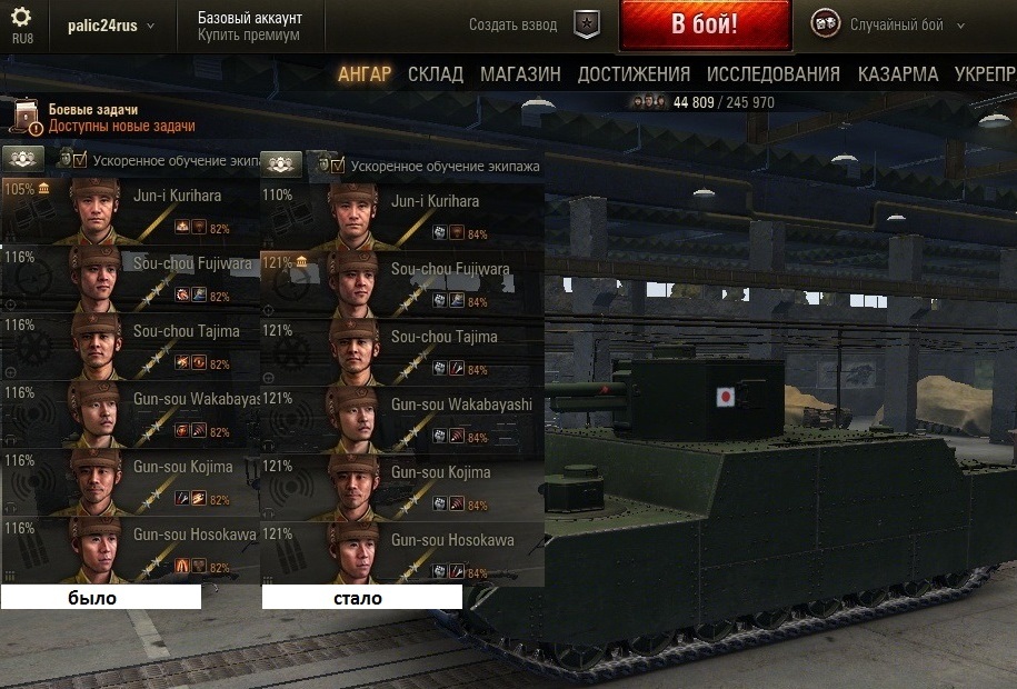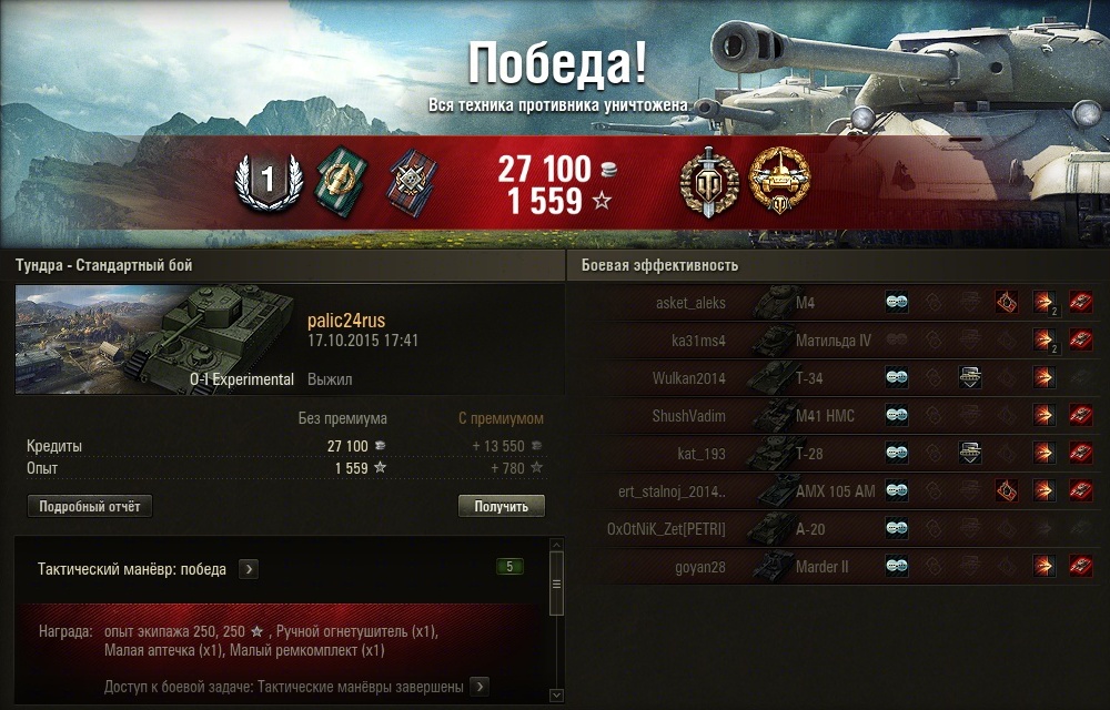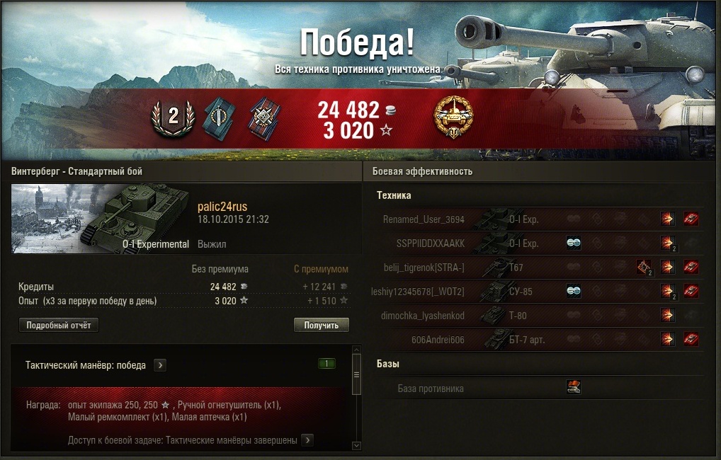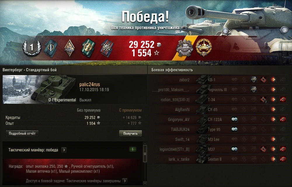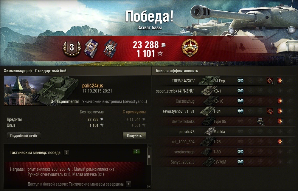 По вашей просьбе выкладываю новый скрин из своего ангара. Различия от того, что были в Химках: переученный после прочтения вашего поста второй радист (у него был радиоперехват), и замена подбоя на просветленку. Мы с игроком zonsawаll часто играем взводом, и он из чисто шкурного интереса (побольше набивать по моему засвету) давно просил это сделать, но окончательно убедил только после трени в Химмельсдорфе. http://cdn-frm-eu.wargaming.net/wot/ru/uploads/monthly_10_2015/post-35486258-0-86131900-1444727814_thumb.jpg