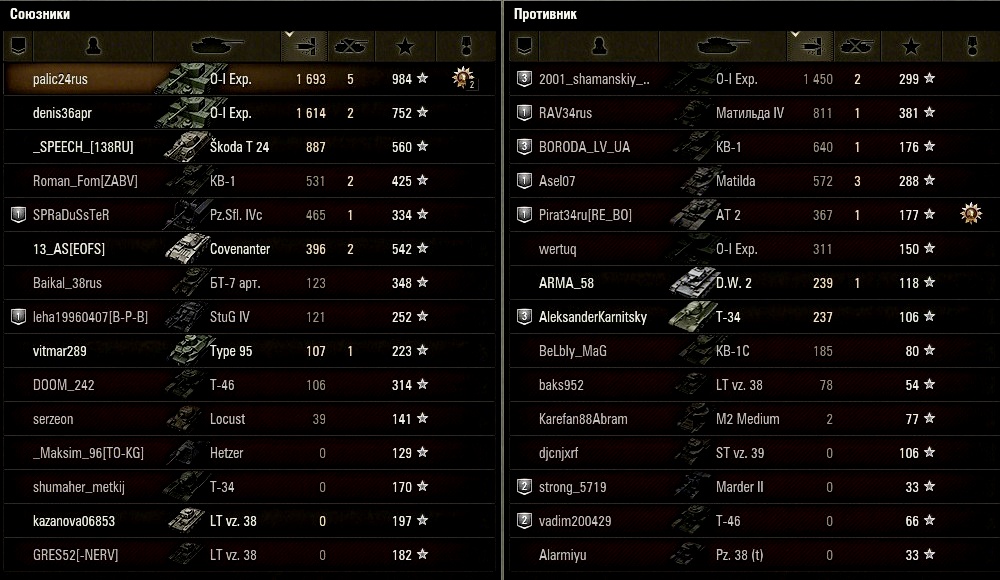 Феноменальные результаты на сабже выдают не многие, а так в топе он неплохо тащит. Вот скрин с обычного боя-обрати внимание кто занял первые 3 позиции по урону. Был в том бою четвертый Эксп (во вражеской команде), но его мы в самом начале зафокусили, не успел он более одного выстрела сделать. http://cdn-frm-eu.wargaming.net/wot/ru/uploads/monthly_12_2015/post-35486258-0-72114800-1450287645_thumb.jpg Впрочем есть оригиналы (на скрине указан стрелкой) которые выходят в бой на стоковом танке и без оборудования. Несмотря на неплохой % попаданий этот "нагибатор" сумел в одном бою нанести 520 урона и в девяти боях слиться по нулям. http://cdn-frm-eu.wargaming.net/wot/ru/uploads/monthly_12_2015/post-35486258-0-14076900-1450294869_thumb.jpghttp://cdn-frm-eu.wargaming.net/wot/ru/uploads/monthly_12_2015/post-35486258-0-90643600-1450294884_thumb.jpg