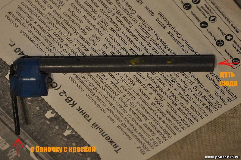 Трубка в которую дуть - часть от шариковой авторучки с небольшим сужением на конце, трубка, в которую поступает краска - стержень от авторучки, вытянутый над огнём, относительно друг друга под углом 90 градусов, тонкая трубка заходит примерно до середины толстойВ прикреплленый файлах - то что получилось, сорри за качество - фотег не очень, да и модели запылились уже :) Как выше уже правильно написали, данный вариант подходит для того чтоб задуть одним тоном большую площадь. Для нанесения полос и пятен малопригоден ввиду широкого факела P.S. мне тут посоветовали еще такой вариант: к обычному аэрографу можно приспособить вместо компрессора камеру от колеса авто. Понятное дело, что компрессор лучше, но может кому пригодится и такой вариант :)