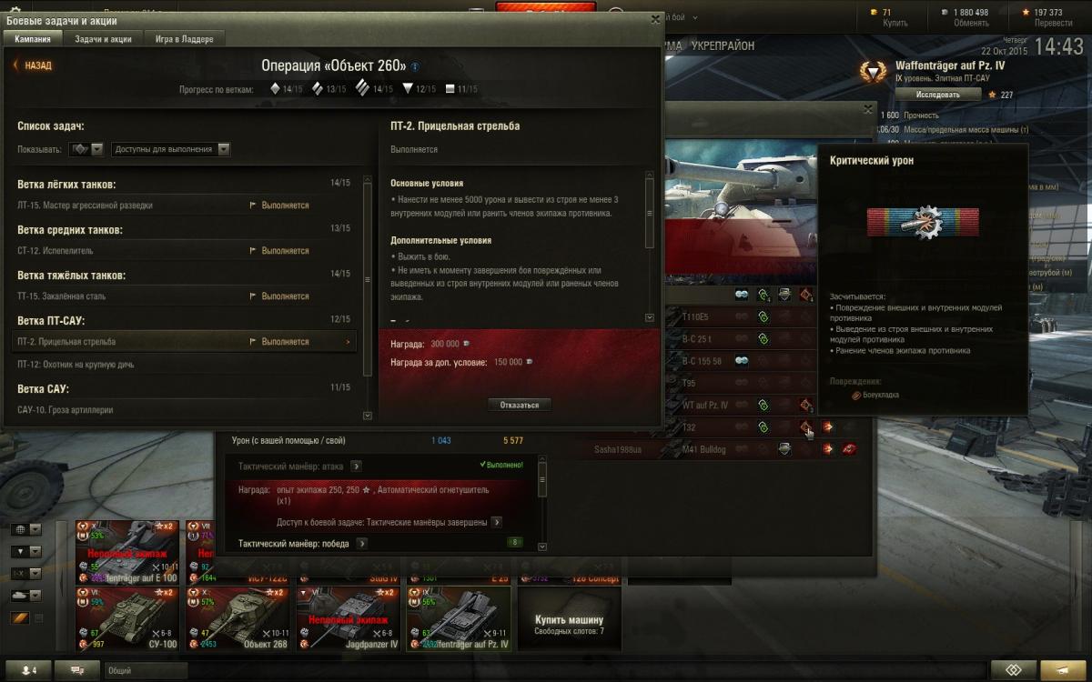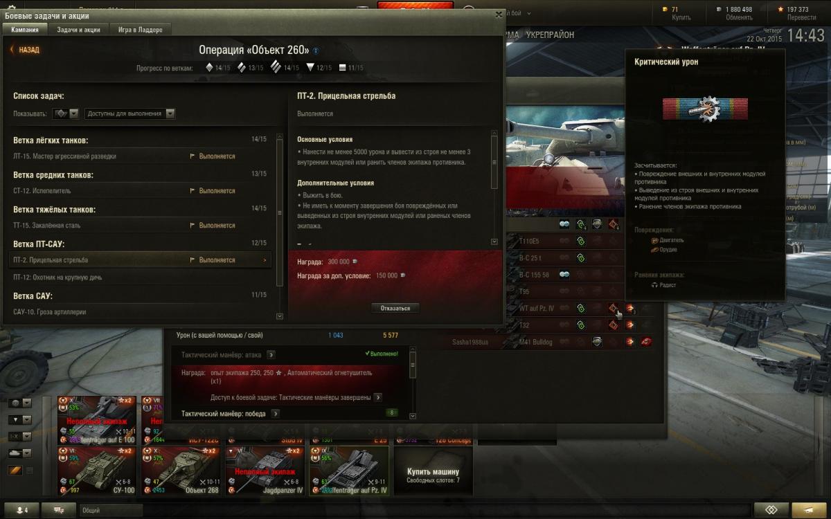 Задача: Нанести не менее 5000 урона и вывести из строя 3 внутренних модуля или члена экипажа машины противника. Нанесено: 5577 урона, повреждены: радист, БК, и двигатель у противников. Почему задача не засчиталась? Задача была 100% выбрана. http://wotreplays.ru/site/6515929#rybackaya_buhta-s1onik-waffentr_ger_auf_pz_iv