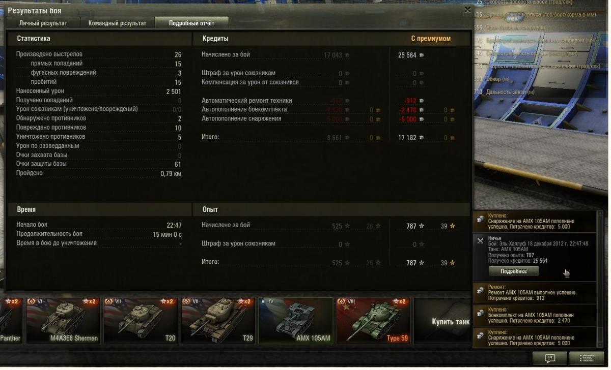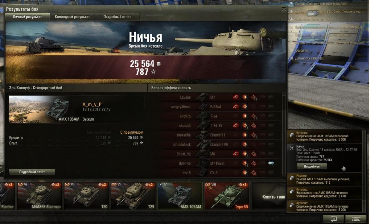САУ АМХ 105АМ Поражение. Кредиты без ПА - 17043, с ПА - 25564 Опыт без ПА - 525, с ПА 787. http://cdn-frm-eu.wargaming.net/wot/ru/uploads/monthly_12_2012/post-3595660-0-01714100-1355858134_thumb.jpg http://cdn-frm-eu.wargaming.net/wot/ru/uploads/monthly_12_2012/post-3595660-0-91405100-1355858363_thumb.jpg