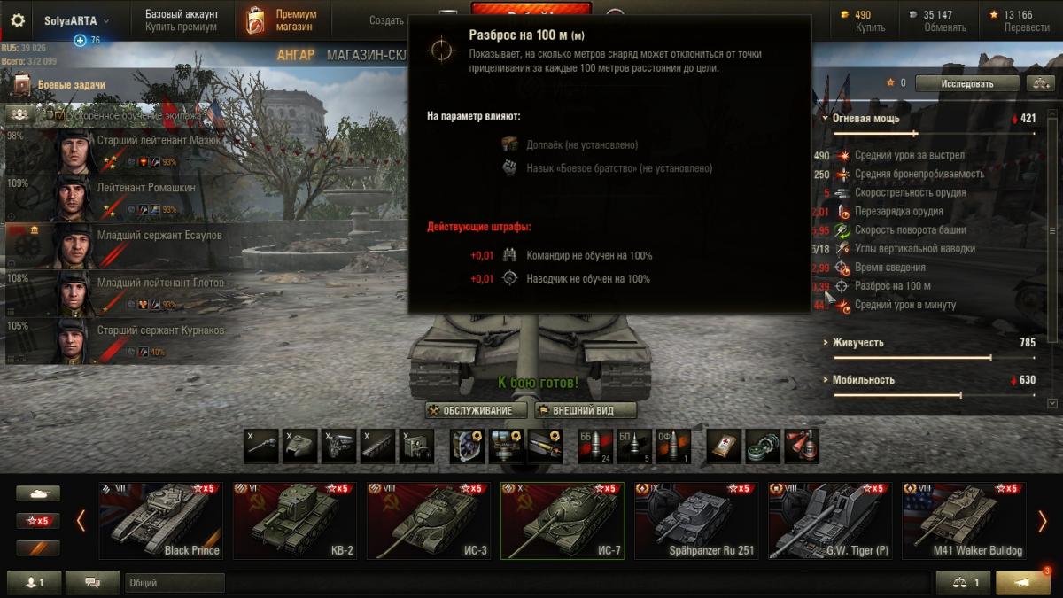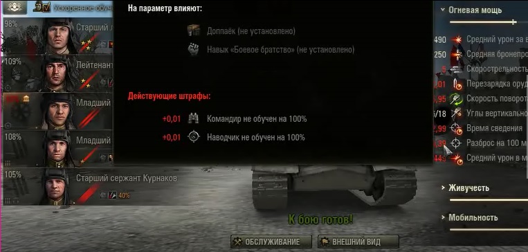Наведя на характеристики орудия ИС-7 я заметил, что на разброс орудия влияют "Вентиляция" и "Доп. паёк". Получается на разброс влияет уровень прокачки экипажа: 110% наводчик + 5% Вентиль + 10% Доп. паёк. А почему не влияет "Боевое братство"? Оно ведь тоже дает +5% к характеристикам.
