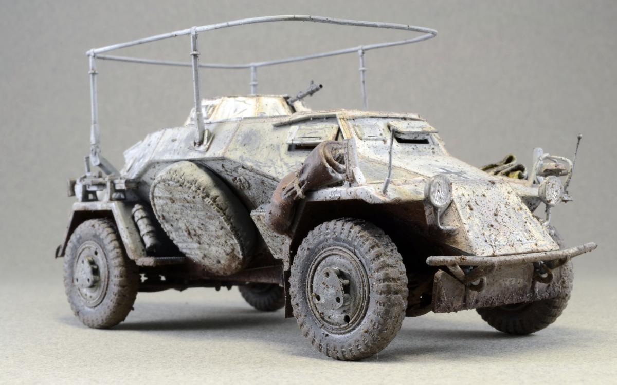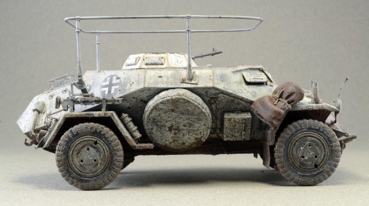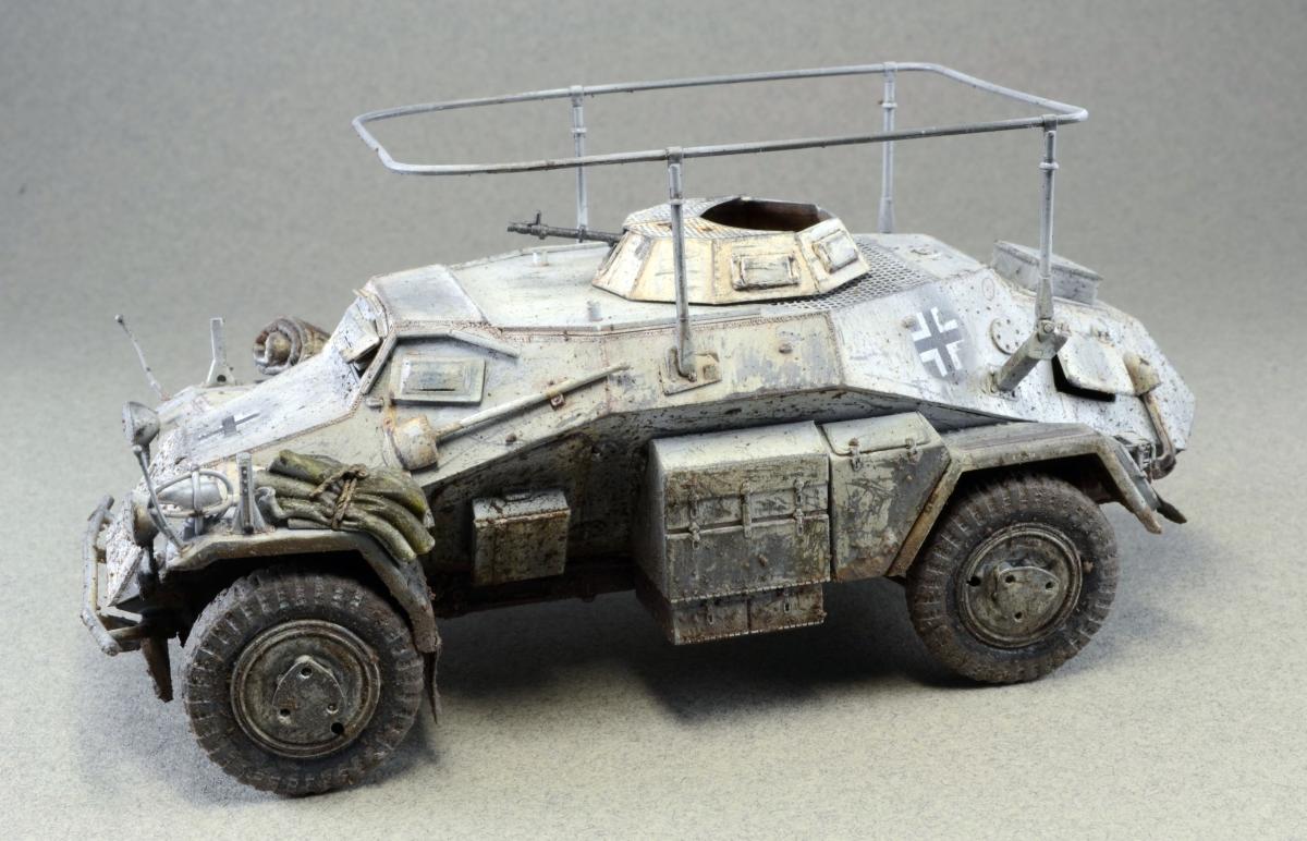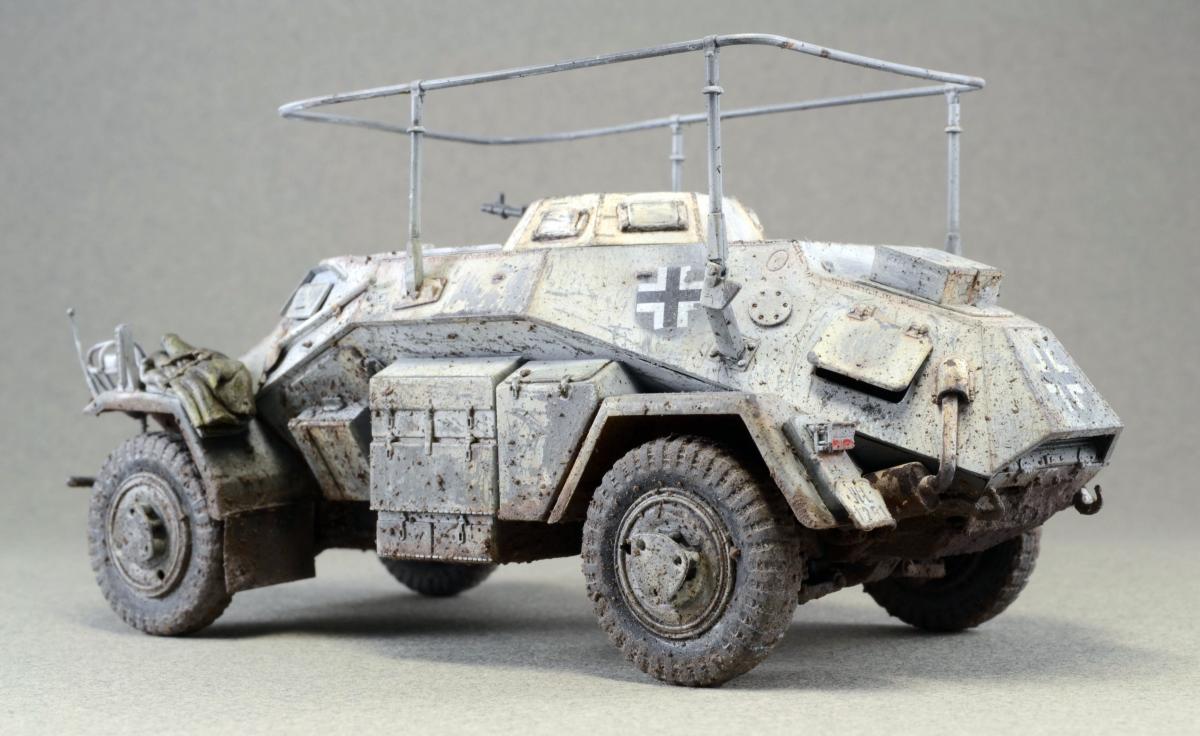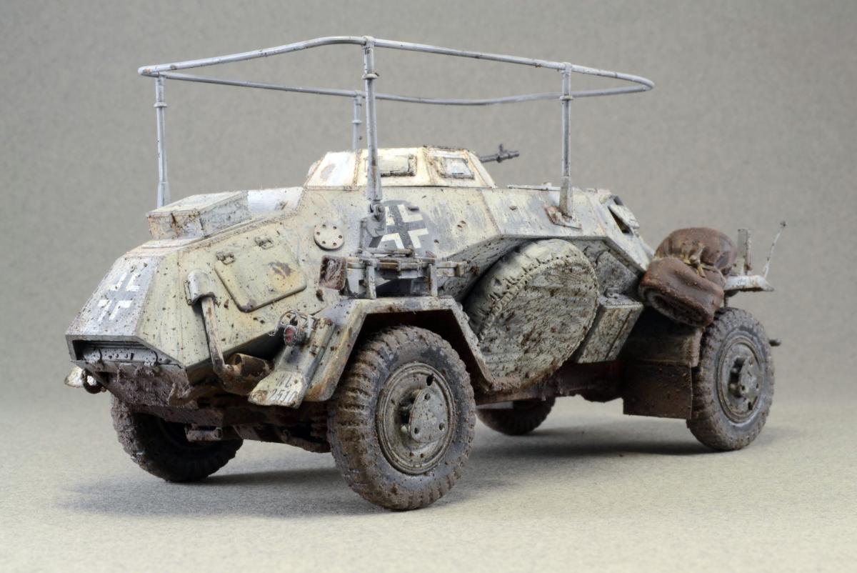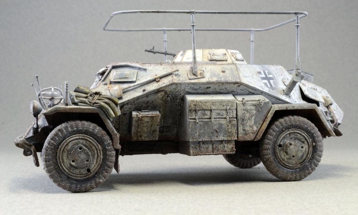 Разрешите представить сообществу свою модель. Немного истории: Leichter Panzerspähwagen, Sd.Kfz.223 — германский лёгкий бронеавтомобиль бронеавтомобиль разведки связи. Разработан фирмой Eisenwerken Weserhütte. Серийное производство началось в 1937 году и продолжалось до февраля 1944 года. Модель собрана из коробки, впервые был опробован зимний камуфляж. Машина примерно на конец зимы-начало весны. Спасибо за внимание.