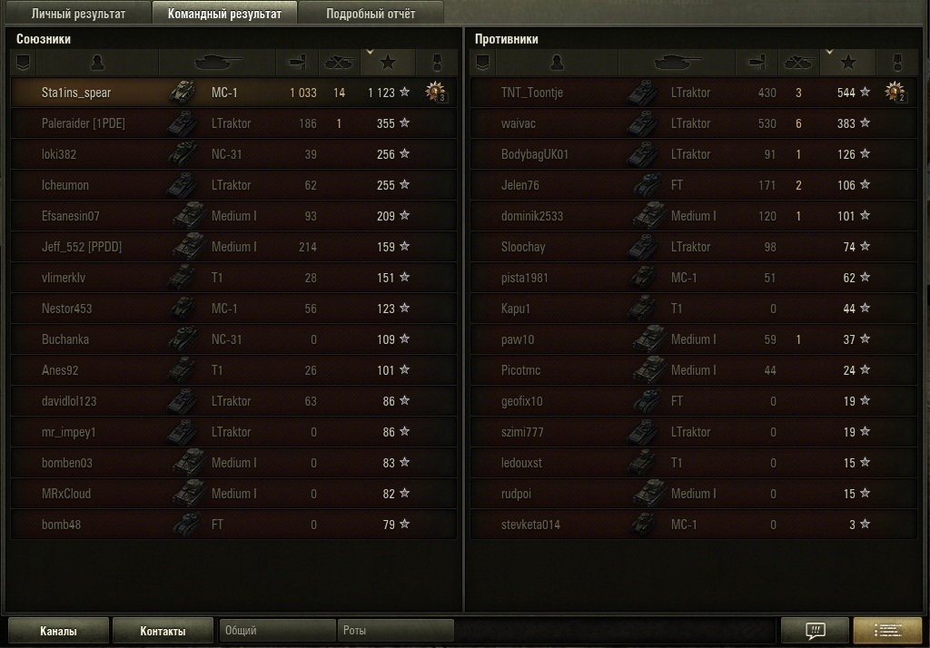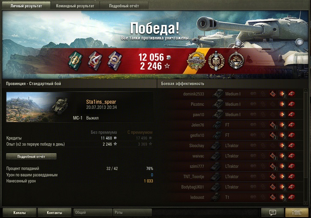 ГОСПОДА, всем спасибо за поздравления да, ВБР помог, стрельба (реакция) могла быть лучче (мне так кажется, когда смотрю реплей), про попадания по окончанию засвета - ну это стандарт (должен быть) для всех да играю без рогов, акк тренировочный засвет союзников - важная вещь для мс1 т. к. самая слабая броня, самый медленный, НО самая мощная пушка на 1ом уровне отсюда логичная ТАКТИКА : занять снайперскую позицию + максимально использовать засвет союзников для Т1 с 20мм автоматом тактика другая - быстрое сближение + быстрое размолачивание (максимальный результат 9 фрагов) поэтому автономно только на Т1, способном одной очередью разнести любой танк 1го уровня и половину 2го как ни крути МСу на 100% фраг нужно 3 выстрела, редко 2 (ВБР всем дает последний шанс - бонус 2-3 хп) экипаж МС1 - 93%, таскать голду чтобы Т18 бить ? - перерасход - дудка кривовата - разброс большой держу МСку исключительно для прикола - хорошо если раз в день звездочку собью, поэтому на обвес денег не трачу играю для фана, любимые лошадки - Пантера, ВК3601, Штуг, Росомаха - точность, скорострельность, маневренность http://cdn-frm-eu.wargaming.net/wot/ru/uploads/monthly_07_2013/post-3660450-0-07110300-1374439711_thumb.jpg
