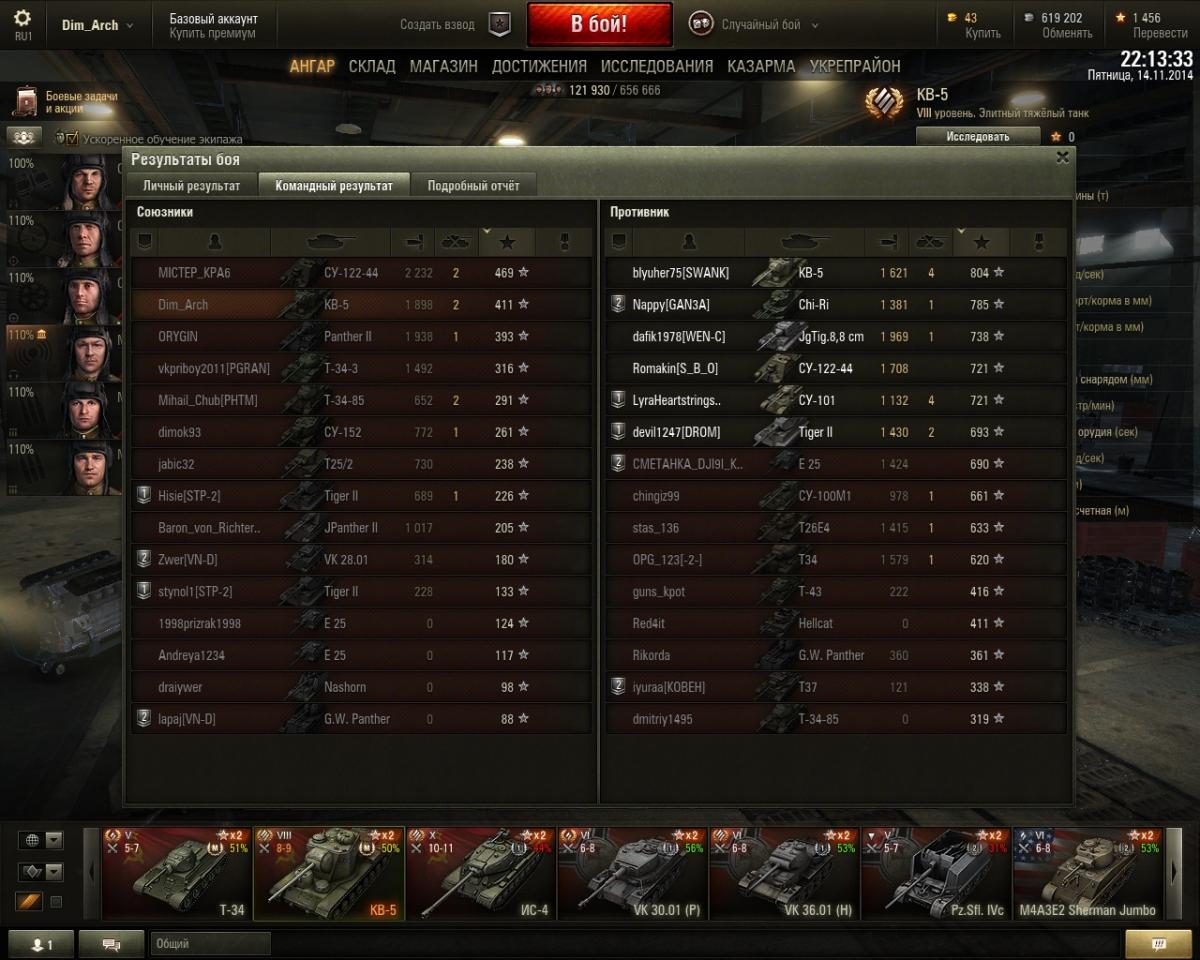 Ну ваши результаты не намного лучше, хотя и большинство машин вами поврежденных или уничтоженных это 8 лвл. Серьезно вы поймали только "хрустальный" Т30 и т-54 (видимо в борт) и все из девяток, немецкую пт 9 лвл не беру, ибо она вообще шьется всеми и вся. Ис-8 вы не пробили, только гуслики повредили, а 704 вам вообще оказался не по зубам. Теперь о доходе, да конечно у вас дела немного получше, но по большому счету это не идет в сравнение с 2012 годом, ваши 78 000 серебра против моих 141 000, которые продемонстрированы на моем видосе выше, практически двукратный (!!!) отрыв по баблу. И еще, я не говорил, что КВ-5 совсем не фармит, ибо фармом может считаться чистая прибыль больше ноля. Вопрос заключается в том, что фарм по сравнению с 2012 годом УРЕЗАН, за счет того, что мы меньше наносим урона по 9 лвл и нас к ним кидает частенько (ваш пример, 3 боя из 5 с 9лвл) , плюс нас шьют все кому не лень за счет голдовой серы, соответственно и живем мы меньше, что тоже не прибавляет нам вистов. То есть, исходя из вышеперечисленного мы делаем вывод, что КВ-5 стал хуже фармить, чем 2 года назад и ТС делает правильный реверанс в сторону разрабов, либо уменьшение уровня боев, либо увеличение доходности при пробитии высокоуровневых машин. Правда есть и третий способ, тупо увеличить пробитие у пухи КВ-5, но на это разрабы не пойдут. Как-то так. http://cdn-frm-eu.wargaming.net/4.2/style_emoticons/wot/Smile_Default.gif В этом то вся и соль. http://cdn-frm-eu.wargaming.net/4.2/style_emoticons/wot/Smile_blinky.gif