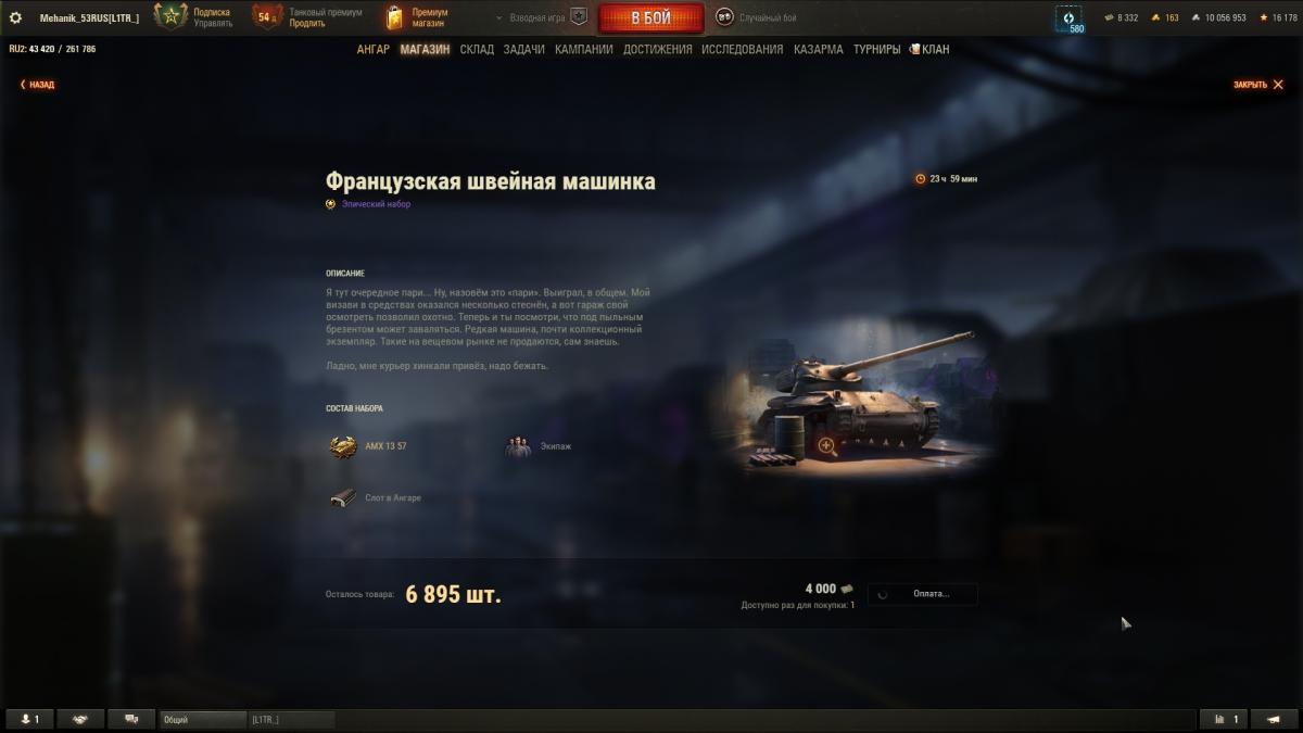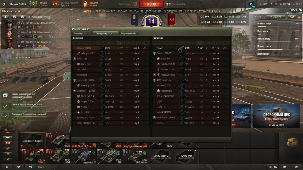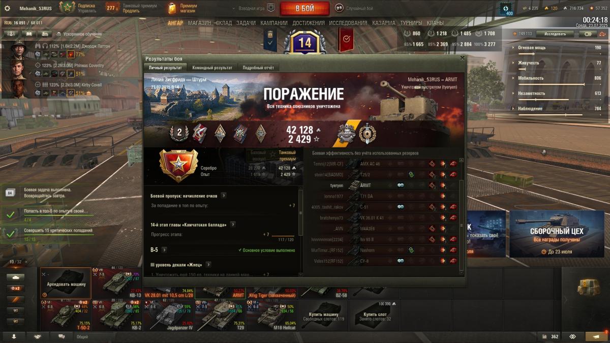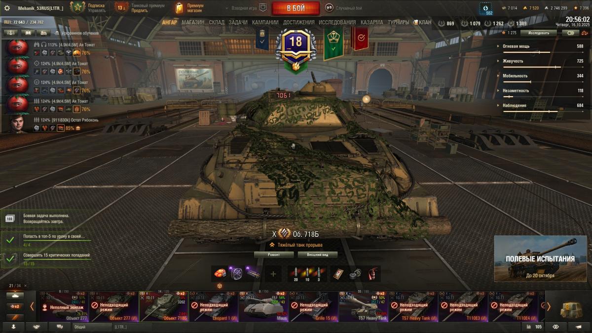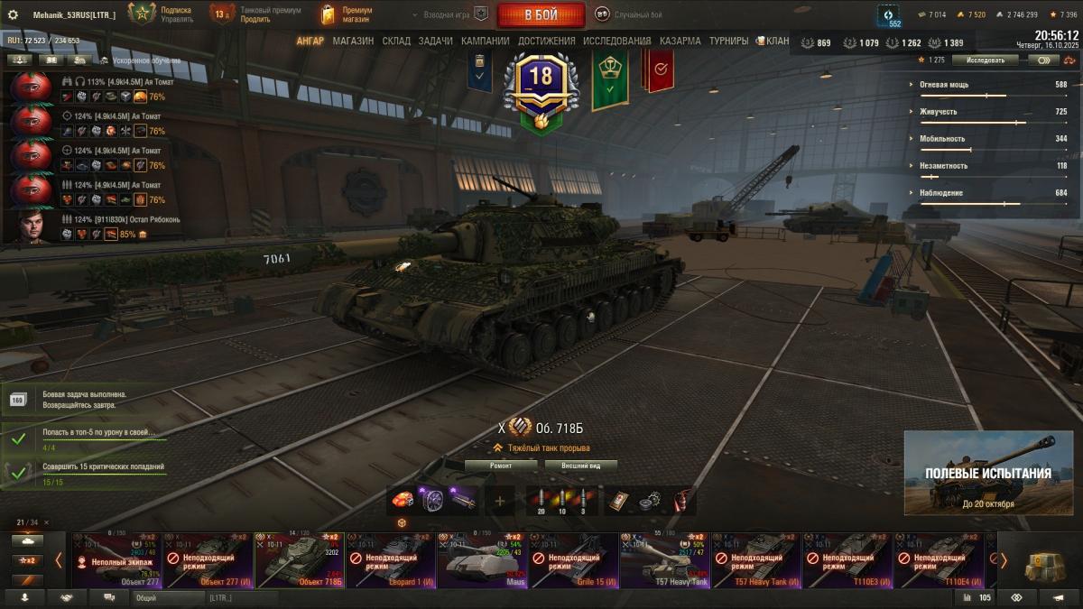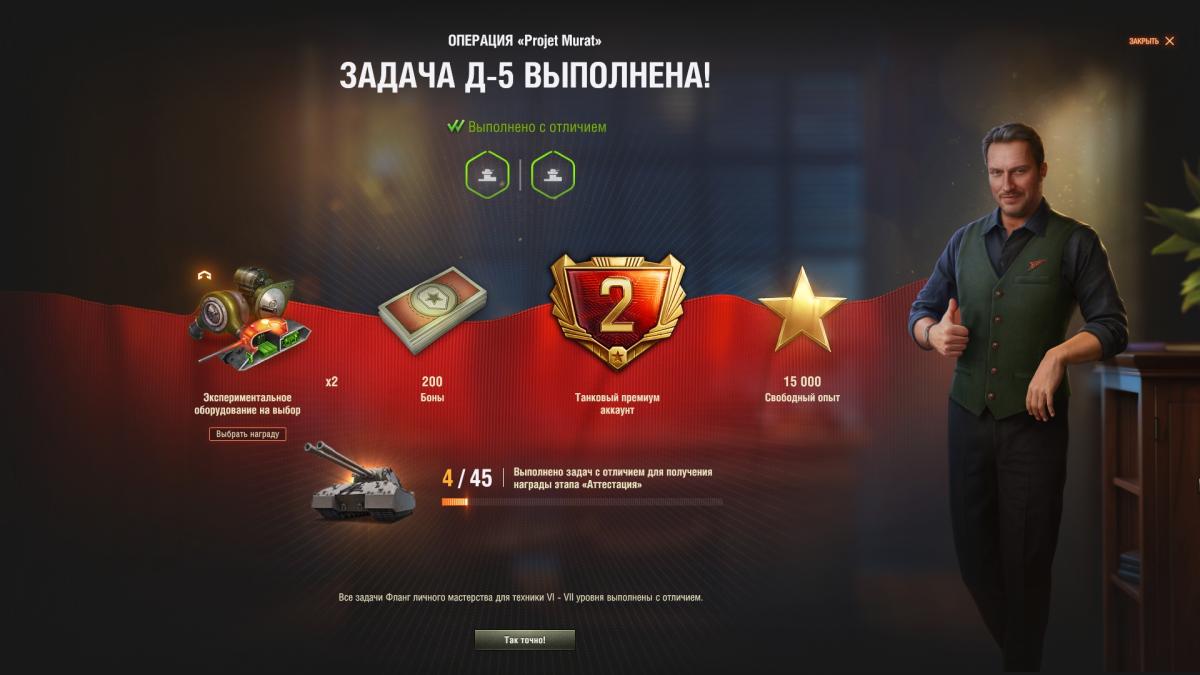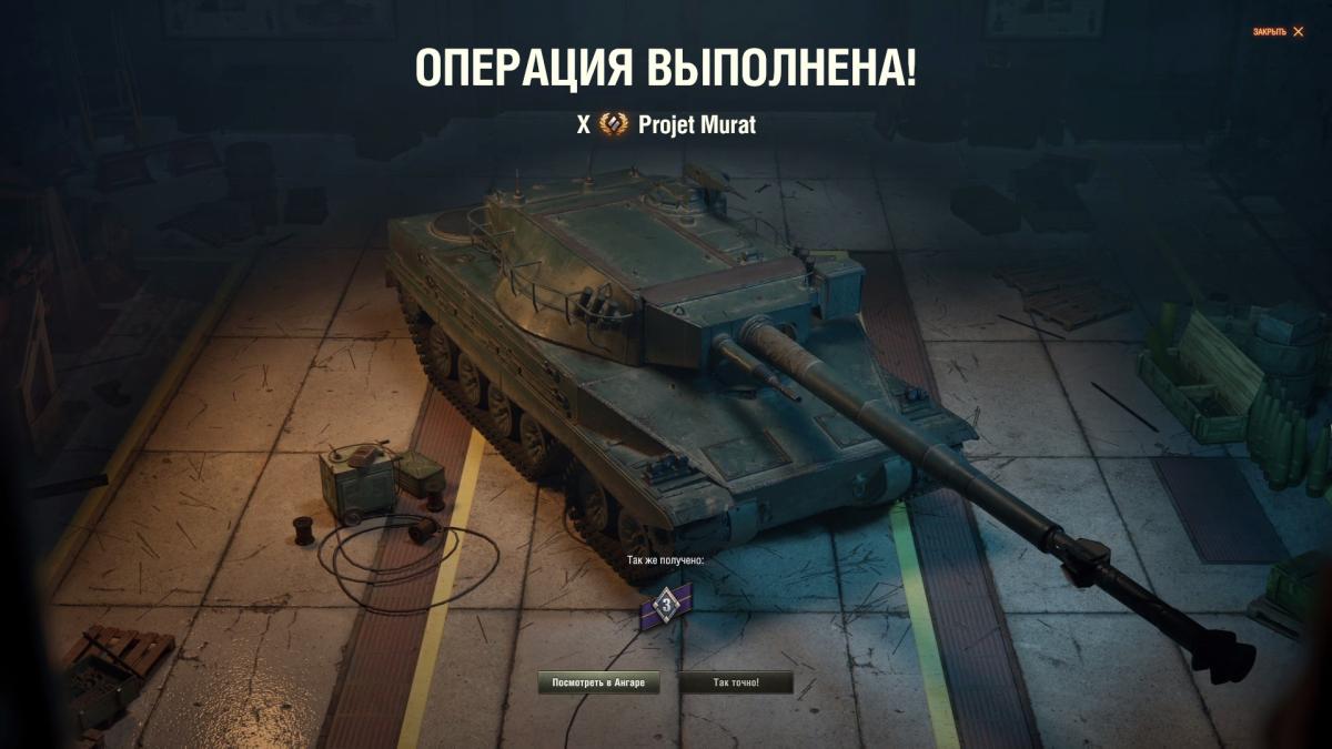 Танк в ангаре. Последнюю задачу Д-5 на 1 степень, выполнял на VK 28.01 105, потребовалось 11 боев. Супер чаффи не зашел у меня. На отлично не выполняю, ибо мало нервов и времени на это Всем удачи, пошел я за муратом