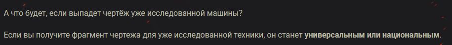 http://cdn-frm-eu.wargaming.net/4.5/style_images/wg/snapback.pngA_Bapbka (27 янв 2020 - 09:56) писал: 2 чая этому господину, всё верно он Вам написал. Из довольствия выпадает фрагмент чертежа на определенную технику, а далее, в зависимости от того, исследована у Вас эта техника или нет - он или применяется на неё, или крафтится в универсальный или национальный. Как таковые отдельно универсальные или национальные фрагменты чертежей не выпадают. То что они сами не выпадают, а переводятся из фрагменов на уже изученный танк я и без него знал. Потому и говорю что эти готовые фрагменты стали переводиться только в униварсальные, а не в универсальные и национальные (рандомно с разной периодичностью) как раньше