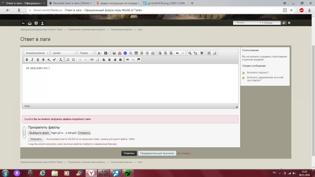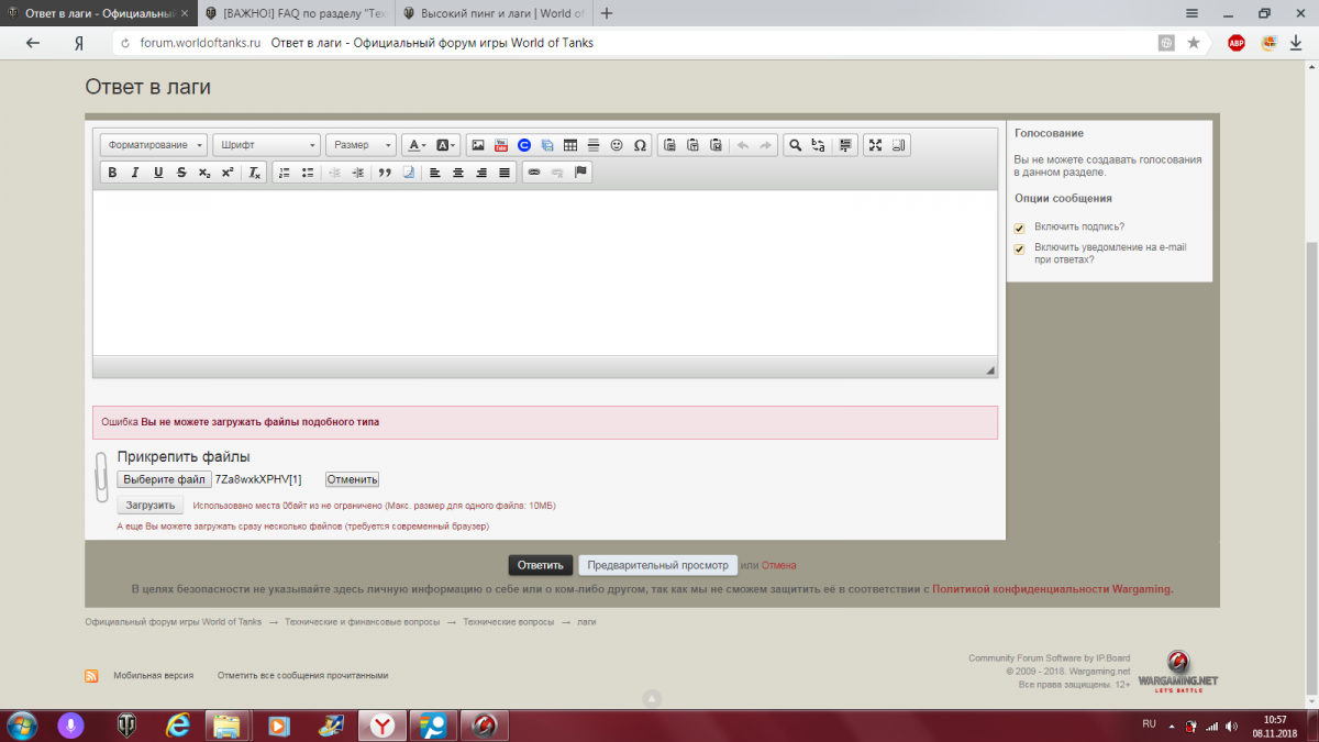 http://cdn-frm-eu.wargaming.net/4.5/style_images/wg/snapback.pngfreethinker (07 Ноя 2018 - 09:05) писал: Одной из причин может быть плохое качество интернет соединения и потери сетевых пакетов. Проведите диагностику, воспользовавшись рекомендациями из базы знаний Высокий пинг и лаги и Установка и настройка PingPlotter. Полезным будет так же ознакомиться с темой на форуме [ВАЖНО!] Решения проблем, связанных с нестабильностью интернет соединения (высокий пинг, потеря пакетов). Отчет программы PingPlotter прикрепите к сообщению вместе с сетевым отчетом WGCheck. Как прикрепить файл к посту Спасибо.