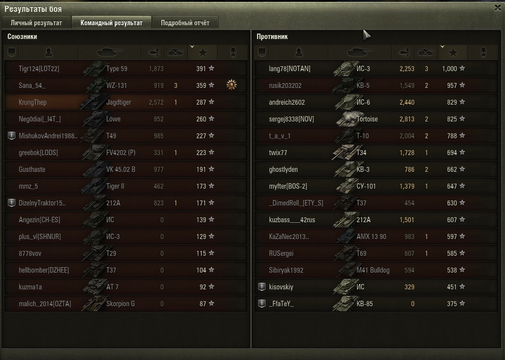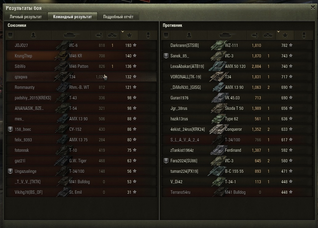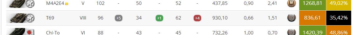 Тут просмеялись про шовинизм, а дело-то дрянь... Напомню, усадил я командиром на Т69 девушку и началось. Ответы - енто только картинка, пару часов не прёт, совпадение. Нефига. Так падает на дно глубочайшей раковой пещеры. Статистикой, естественно. Пока сидел непереученный с паттона экипаж, а сам Т69 был не в топе. WN8 было около 1000, а процент побед около 50. Смотрите - прокачал, посадил командиром даму: процент побед стал 28%! http://cdn-frm-eu.wargaming.net/wot/ru/uploads/monthly_03_2015/post-3830397-0-01878500-1426624265_thumb.jpg P.S. Топовое орудие какое-то мега кривое. Может и с десяти метров в упор не попасть. Выцеливать им после "свежего" обновления невозможно - сваншотят, пока прицелитесь. На ходу лишь 1/4 попадает. Байка про "отстрелялся и спрятался" не прокатывает. Все красные знают, что ты отстрелялся и пора тебя в гараж отправить. Получится спрятаться, только если стоишь на границе видимости. На СТ. Типа быстром и маневренном. И, стоя вдалеке, читаешь остроумие игроков состоящее в ***. Кстати, сейчас подавляющее большинство Т69 играет недалеко от позиций арты, стараясь весь бой не проявляться. Ну и часто в конце попадая на буккаке вечеринку. Пока не увидел ни одной игры, где Т69 оказал бы решающее влияние на бой. Как, например, Першинг. Или Тип, или Т-44. Вобчем, подумываю продать это вместе с дамой нафиг. Никакого удовольствия. И гора кирпичей. Свезло сразу с парой. Этот и М53/55. Думал, Ягдтигр кактусный танк, ан нет - вполне себе играбельный. А St. Emil - просто драйв-машина, которые надо поискать. В сравнении, конечно, с "парочкой".