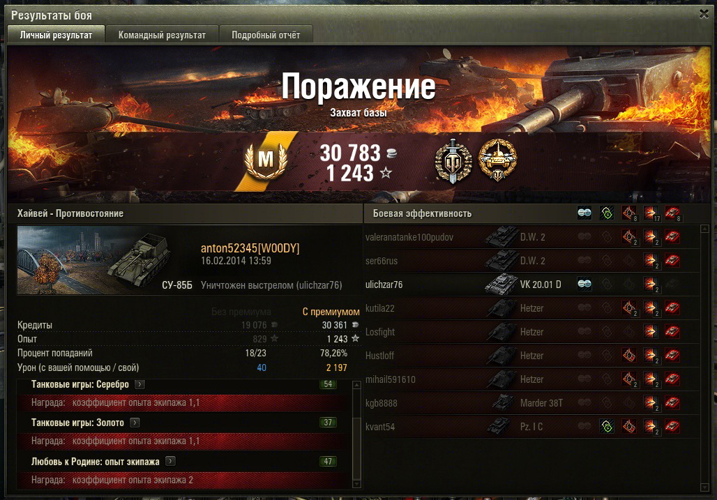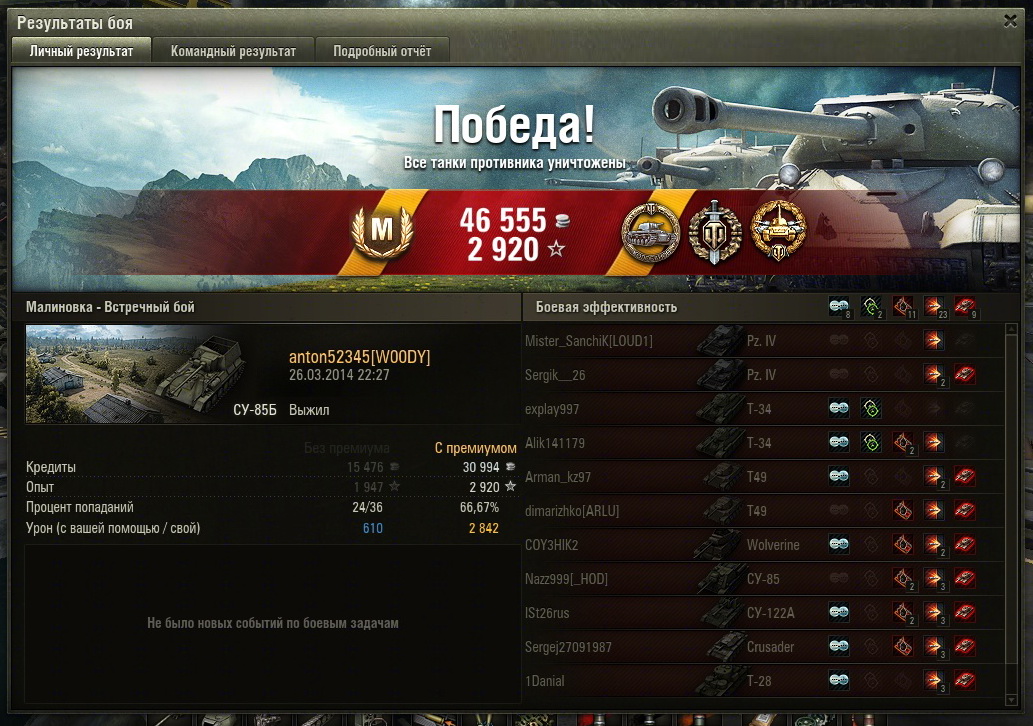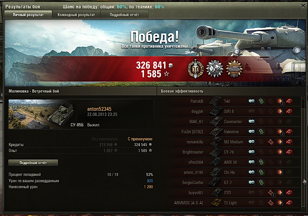 Да, к сожалению с бэхой последнее время что то не то происходит. Стрелять до полного сведения, как раньше, стало совсем невозможно. Да и с пробитием порой не всё в порядке, а уж про неприятную фразу "Повредил гусеницу" и без урона я вообще молчу. Но тем не менее она остаётся бэхой, которую многие соперники недооценивают - до поры до времени... http://wotreplays.ru/site/2237414#malinovka-anton52345-su-85b http://cdn-frm-eu.wargaming.net/wot/ru/uploads/monthly_03_2014/post-3794249-0-31643400-1395860603_thumb.jpg