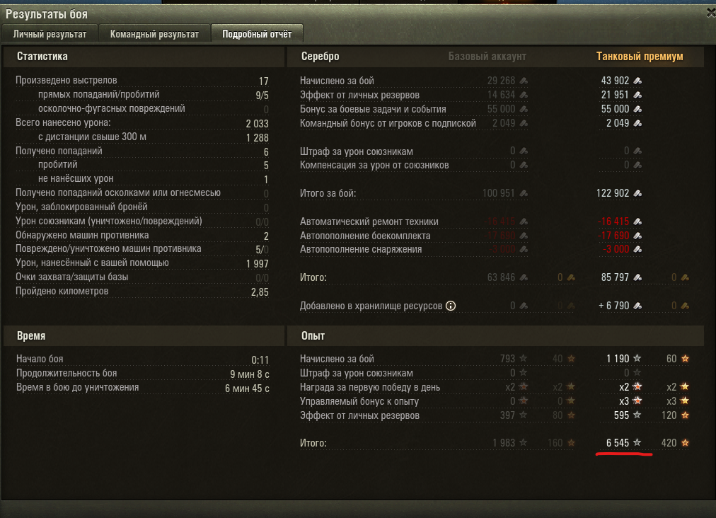 Добрый вечер всем. Это баг? Начислено по итогу боя 6545 опыта. Считаем 1190*2*3=7140 7140+595=7735, а по скрину - 6545. Как так? Если ВЫЧЕСТЬ "Эффект от личных резервов" 7140-595=6545, то как раз получается. Но это же не логично. Личные резервы в минус, а не в плюс тянут В формуле накосячили или я не верно понимаю механику расчёта? Проверил на нескольких боях - тоже самое. Ваши комментарии.