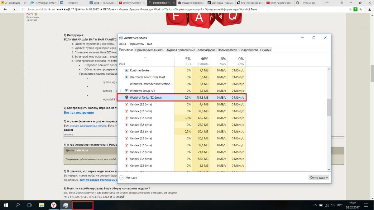 Доброго остатка февраля, Юша. Давно и упорно пользуюсь твоей сборкой, как почти оптимальной и требующей минимум дополнений и минимальную настройку конфига под себя.и свою хвастливую натуру. К сожалению, после установки сборки 0.9.17#4 возникла проблема, а именно: после запуска лончера, при попытке войти с его помощью в клиент игры, на какой то стадии процесса загрузки последняя прекращается, приложение закрывается, при этом процесс продолжает висеть в диспетчере задач (см. Скрин 1). При деинсталляции сборки модов на чистом клиенте игра загружается нормально, как и в безопасном режиме. файлы python.log, xvm.log и loginstall.inf прилагаю. P.S. Если это поможет, то при удалении модов грубо через стирание папок в res_mods и папки multypack проблема оставалась до переустановки клиента. Ссылка на файлы: https://cloud.mail.ru/public/JW5R/z1oMWqyiR