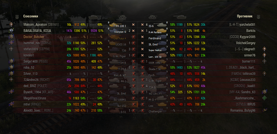 даже беглый взгляд не дает шансов моей команде...вот вам наглядно-как работает баланс в этой, с позволения сказать, игре...как можно так подобрать составы, что у нас игроков с процентом побед 50+ 5 человек, а у соперника 9?...да и общий уровень намного ниже! это специально так делается?тут уж нечего возразить-я показываю всё как есть! так всегда работает баланс? ...итог: я отыграл с таким "балансом" 7 игр, естесно выиграл только одну, и то случайно...благо урон наносил более-менее и не в убытке остался...ушел ясно с каким настроением...спасибо Леста за "прекрасный" вечер...