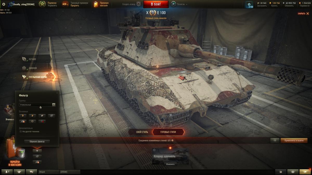 Доброго вечера, танкисты! Такой вопрос - есть 2D и 3D стили во внешнем виде, хотел быстро пробежать и глянуть на каких у меня танках не одет 3D стиль, но в фильтрах внешнего вида такой функции не нашёл! Неужели ее нету? Как пример - уникальные не отображают 3D стили (на моей 100-ке смотрел, скрин ниже). Так как быстро и проще на всей технике найти и выбрать стили, если во внешнем виде фильтры устарели и не отображают то, что нужно!