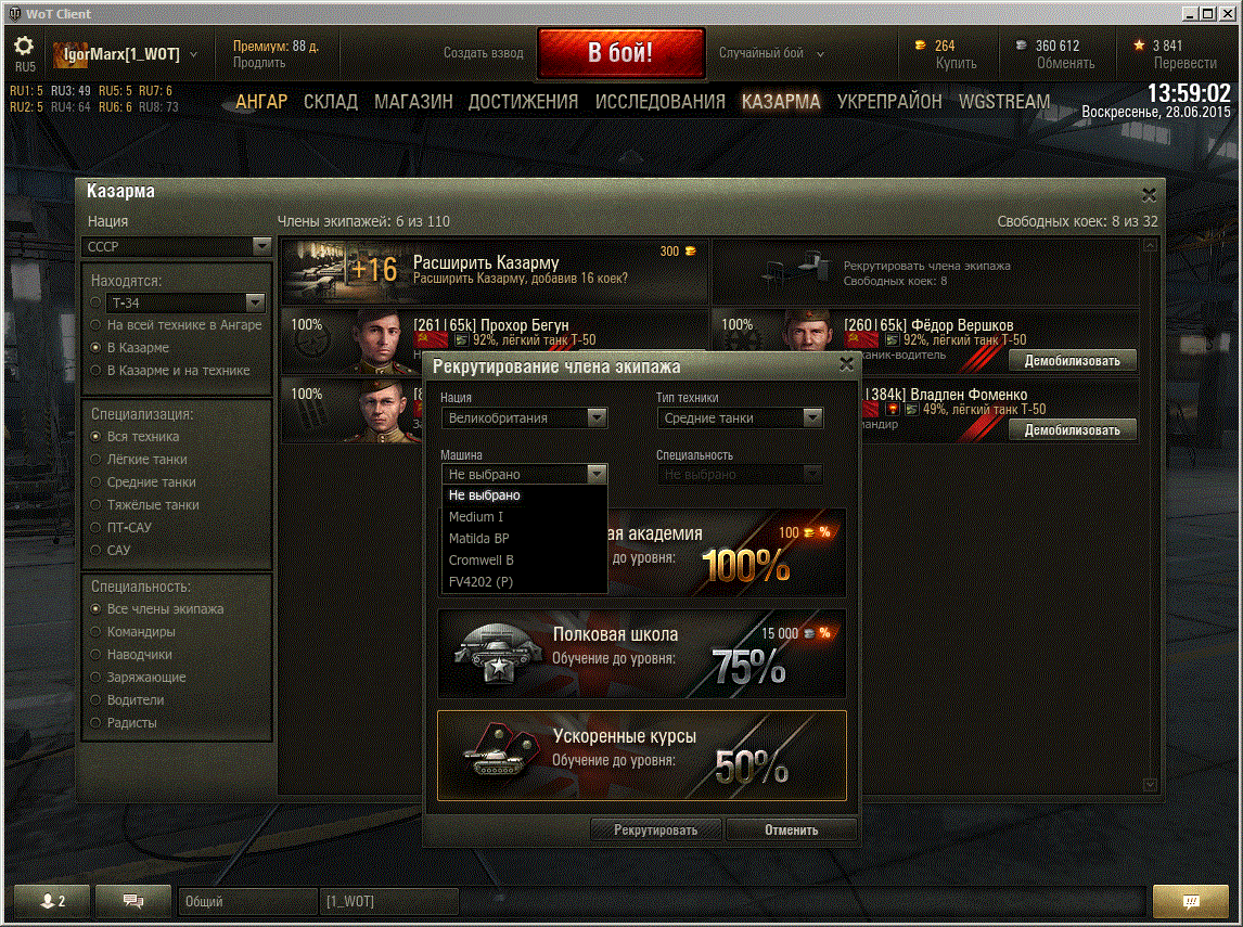 Здравтсвуйте. Сегодня, пока идёт скидка на обучение экипажа, хотел рекрутировать экипаж на танк Cromwell, так как собираюсь его выкачать в ближайшем будущем. Подготовил койки в казарме, выбрал Британию, СТ. Но в списке не нашёл "Cromwell", а нашёл "Cromwell B". Удержался от найма с потратой игровой валюты на их обучение, решив сначала уточнитиь что за это за такая буква "B" в конце. Хорошо, что удержался: этот танк невозможно приобрести на серверах RU. Хотелось бы понять логику это сделана ли эта "подстава" специально, или это какая-то ошибка? Такая ошибка могла мне стоить реальных денег. http://cdn-frm-eu.wargaming.net/wot/ru/uploads/monthly_06_2015/post-41072012-0-80646300-1435489192_thumb.gif