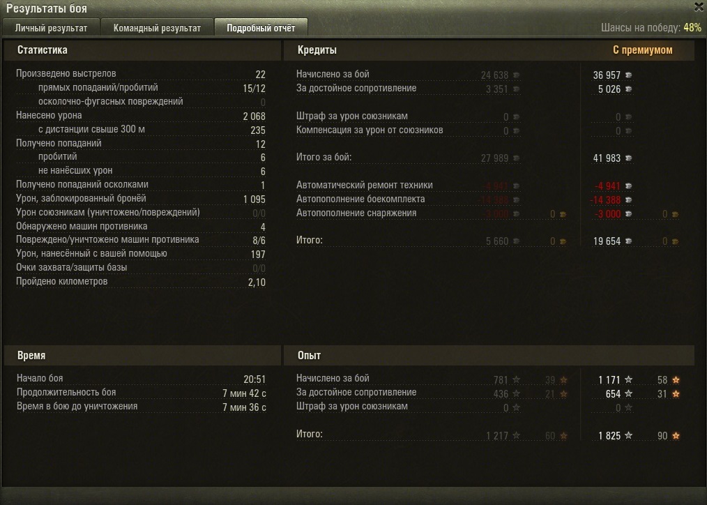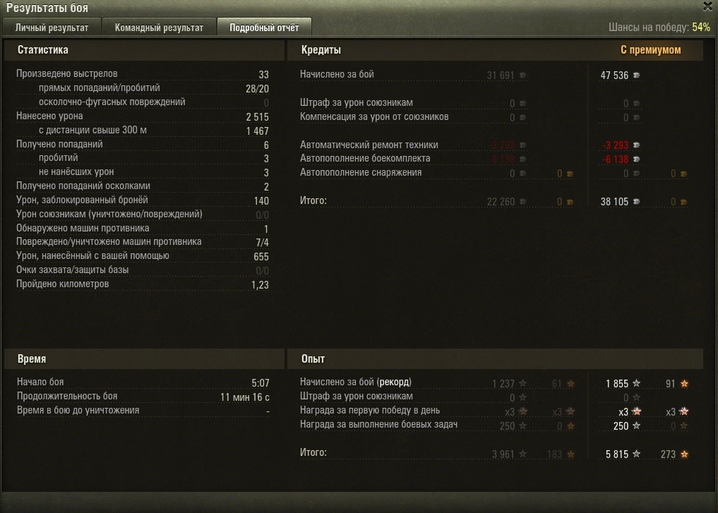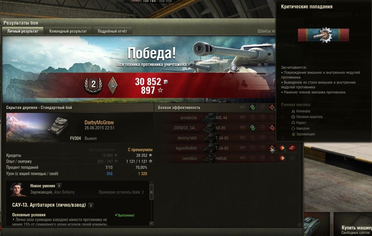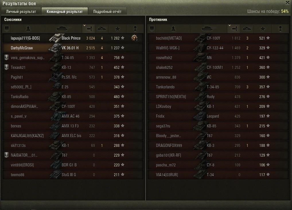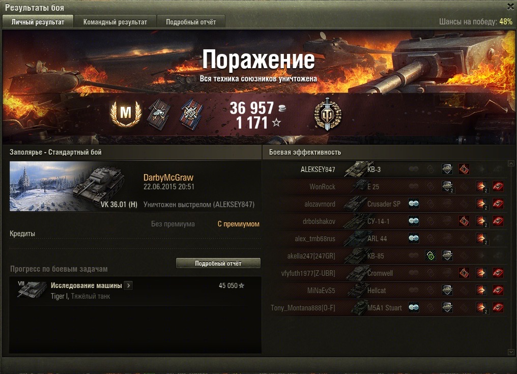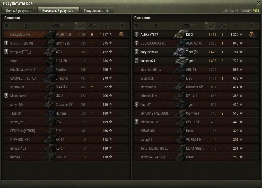 По идейным соображениям, сразу после исследования поставил "ахт-ахт" и катаюсь с ней. Во-первых, ИС-6 она всё же пробивает. В верх корпуса за башней и в корму, но в корму через раз. Довелось клинчевать с ИС-5 (ну, так карта легла) - стабильно бьёт в лючок командира. На его КД нанес ровно 880 дамага. Снял бы и больше, но был коварно съеден с тыла. Во-вторых, пушка относительно неточная, снаряд летит медленно, и кемперить особо не получится. В-третьих, в игре против 8 лвл мы практически бесполезны. Пробиваем только французов, и то без 100% гарантии. Соответственно, хоть кемперить и сложно, но больше ничего не остаётся - залезаем в кусты, светим трубой и ждём, когда кто-нито не покажет нам филейные части. Не стреляем в лоб, не стреляем в толстые борта - только зря засветимся. В-четвёртых, против 7 лвл можно жить, хотя и сложно. ДПМ у них, в целом, такой же, как у нас (вот у Е 25 однозначно выше, у кого ещё - не скажу, не считал). Проблема в том, что они нас пробивают почти всегда, мы их - гораздо реже. Поэтому а) не стоим, двигаемся, сбиваем прицел; б) стараемся зайти в борт; в) как ни странно звучит, но стреляем преимущественно без особого выцеливания, а то и по автоприцелу. Объяснение простое: альфа у нас низкая, и ставить лучше не на неё, а на то, что удастся поймать непробитие от врага. А для этого надо двигаться. А в движении сложно целиться. В-пятых, будучи в топе, мы вполне полноценные ТТ. Нас многие не пробивают, мы пробиваем почти всех. Здесь уже можно и башней поторговать, и потанковать по-взрослому. Даже при штурмовом стиле, труба маст хэв. Пригодится в боях 8 лвл, да и вообще, иной раз полезно остановиться, подождать трубу и посмотреть, что вокруг. Обзор позволяет, надо пользоваться. Upd: Вот такой вот обидный Мастер случился напоследок: http://cdn-frm-eu.wargaming.net/wot/ru/uploads/monthly_06_2015/post-41628769-0-77516400-1434996133_thumb.jpghttp://cdn-frm-eu.wargaming.net/wot/ru/uploads/monthly_06_2015/post-41628769-0-34852300-1434996135_thumb.jpghttp://cdn-frm-eu.wargaming.net/wot/ru/uploads/monthly_06_2015/post-41628769-0-46389900-1434996148_thumb.jpg Добрать КВ-3 не мог никак - в лоб он голдой не берётся, а ХП у меня оставалось на 1 чих. Собссна, и это ничего не решало, их всего трое оставалось, т.е. без шансов. Пользуясь случаем, передаю привет трём водятлам, ушедшим в ангар с нулём, будучи топами по левелу и/или дамагу. VK 36.01 H пройден легко и без напряжения, за 72 боя. До 1-й отметки осталось меньше процента, добью для проформы, но танк оставлять смысла не вижу - с таким набором орудий он чисто проходной, хотя мог быть настоящей конфеткой. Для этого у 8,8 надо слегка зарезать скорострельность и прилично апнуть бронепробитие. ДПМ в 1800-1850 будет вполне достаточно, если бронепробитие будет порядка 155-160 мм. Хотел бы ещё пару слов добавить о поведении в бою, когда мы в середине списка. Не стоит отыгрывать ТТ - не сдюжим. 36.01 в девичестве был СТ, вот и вспомним годы молодые - едем с СТ. На Хайвее, в Заполярье - через верхний левый край, ну и т.п. Вот там появление 36.01 будет производить фурор среди дохленьких СТ. Главное, надо помнить, что с горки мы вваливаем все 50 км/ч, а вот в горку едва ползём. Успехов, дорогие поедатели кактуса http://cdn-frm-eu.wargaming.net/4.4/style_emoticons/wot/Smile_Default.gif