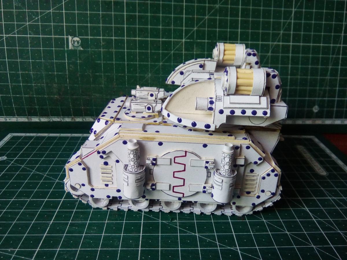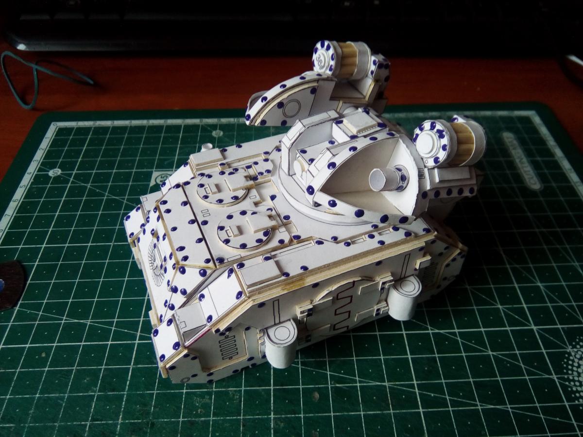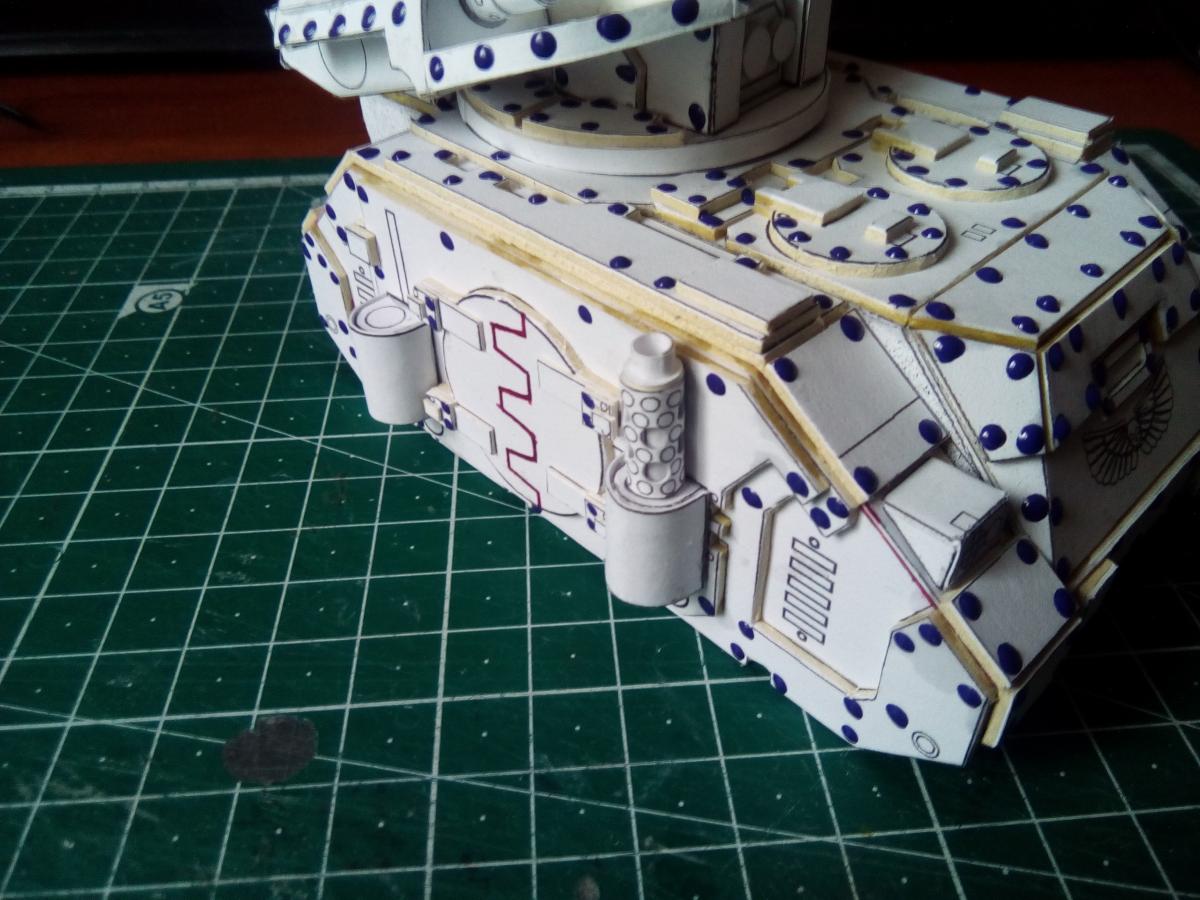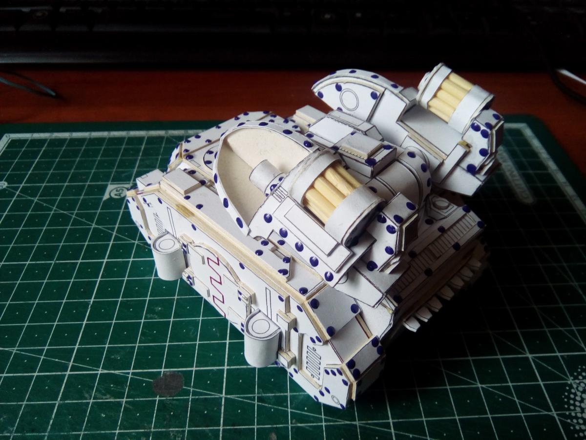 Всех приветствую! http://cdn-frm-eu.wargaming.net/wot/ru/uploads/monthly_08_2020/post-4191913-0-39199000-1597130659_thumb.jpg Около полутора лет назад Elle Patoroch выпустил очередную авторскую фантазию на тему гибридизации реальной техники с техникой вселенной Warhammer 40k. На основе работ западных коллег, уже успевших собрать и окрасить данную модель, я решил попробовать и сам. Процесс этот во времени растянулся по не зависящим от меня причинам. Собирал все без особых отступлений от развертки, добавил чуточку проволочных элементов из припоя и заклепки. Заклёпок 2 вида: из акрилового контура на корпусе и из шариков припоя BGA 0.76mm на ходовой части. Заклепки из шариков ставил в порядке эксперимента. Нервов проклепать в такой же технике корпус у меня увы не хватило. Вышло слишком трудоёмко. Покраска выполнена при помощи аэрографа, красок от Ammo mig и vallejo. Попробовал сделать некоторое подобие цветовой модуляции. Вышло не торт, так как это первый полноценный и сколь-нибудь осознанный опыт в данной технике. Фото результатов: Spoiler Подробнее о сборке в формате видео: Spoiler