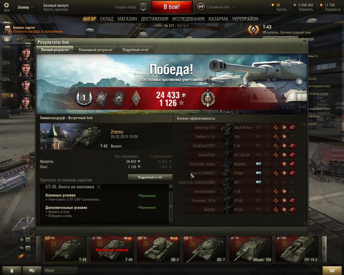 Ну наконецто! Выполнил ст15. Все же самым тяжелое для меня оказался испепелитель. Как писали выше, задания для т55 буду в чем то легче.http://cdn-frm-eu.wargaming.net/wot/ru/uploads/monthly_02_2015/post-4217303-0-05705300-1424957268_thumb.jpghttp://cdn-frm-eu.wargaming.net/wot/ru/uploads/monthly_02_2015/post-4217303-0-51257700-1424957259_thumb.jpg