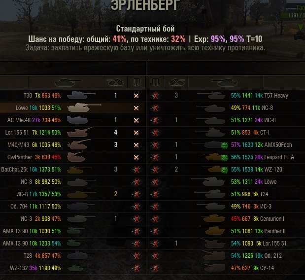 Вот в чём с таким овощем можно соревноваться? http://cdn-frm-eu.wargaming.net/wot/ru/uploads/monthly_06_2013/post-4275015-0-22611700-1370057282_thumb.jpg кто быстрее сольётся? Это чудо мне два боя подряд попалось, на амер тт т34 был(три прем тт 8лвл *** они ему :facepalm: ), один бой 300 дамага нанес, в другом 200 . И это при 20.000К боях, для чего так играть, смысл ?!? Насчет шансов на победу: http://cdn-frm-eu.wargaming.net/wot/ru/uploads/monthly_06_2013/post-4275015-0-23986400-1370057290_thumb.jpg Если по чесноку, даже надежды не было что мы победим (афк никто не был!). Я просто поехал на привычное место и решил что дорого врагам обойдется мой уход в ангар. Мне это удалось, что ни выстрел так попадание с дамагом, походу ВБР был за нас . К моему удивлению в том бою взвод крутого клана выбрал тактику анального дэфа, это их и сгубило. Но некоторые показатели Оленемера в бою всеже помогают: игрока с низким КПД проще развести на выстрел в гуслю или в башню, если он перестреливается с моим союзником, то уже точно не будет смотреть по сторонам или карту, а значит можно смело выезжать и спокойно прицелившись стрелять. Чаще останавливается на открытых местах, не будет маневрировать при арт обстреле, и т.д и т.п.