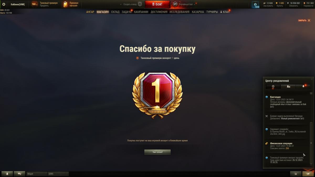 Дайте разъяснение пожалуйста. Прем аккаунт у нас действует 24 часа, но при начислении прем аккаунта от тарифа игровой или получении с БП или покупки аккаунта получаю такое уведомление. "Танковый премиум аккаунт продлён. Срок действия истекает 26.12.2023 11:18:35." но операцию по покупке то я совершил "Финансовая операция Дата: 13.07.2023 19:40:37 Списано золота: 250" из этих данных получается последний полученный прем аккаунт действует не 24 часа а всего лишь 18 часов. Скриншот 045 начисление Прем аккаунта за Тариф Игровой, 046 это я купил Прем на день. Кто разбирается в начислении Према помогите пожалуйста.