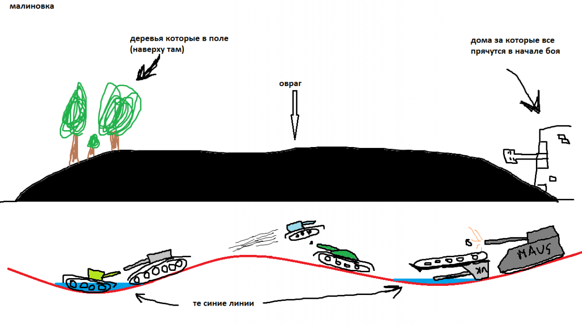 мне понравилась очень малиновка) но есть одно предложение для стычки тяжей на этой карте. Например: http://cdn-frm-eu.wargaming.net/wot/ru/uploads/monthly_04_2013/post-4282963-0-15638900-1366815276_thumb.jpg на месте черного цвета сделать овраг чтобы танки не выезжали на поле снизу на месте красного цвета - сама земля(дорога) поверхность вообщем где будут ездить на месте синего цвета сделать мини-заливы чтобы они находились ниже поверхности красного цвета, т.е. это придуманно для того чтобы танки прятались в этих ямах(синих) а чтобы сделать выстрел поднимались чуть назад либо вперед. П.С кто понял тот понял, кто не понял тот не понял. П.С.С извините за поинт а не ваш фотошоп и 3дмакс П.С.С.С подробнее (вид с К1 (остров)) - (тактика для норм людей) http://cdn-frm-eu.wargaming.net/wot/ru/uploads/monthly_04_2013/post-4282963-0-72114300-1366816747_thumb.png П.С.С.С.С (тактика для рогатых) http://cdn-frm-eu.wargaming.net/wot/ru/uploads/monthly_04_2013/post-4282963-0-57050900-1366817500_thumb.png П.С.С.С.С.С ширина проезда должна быть такая чтобы маус мог встать поперек и все перекрыть