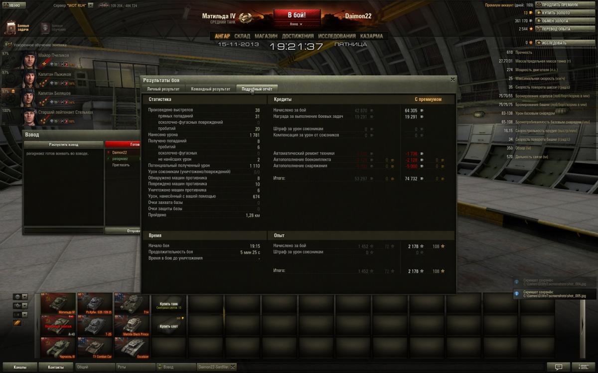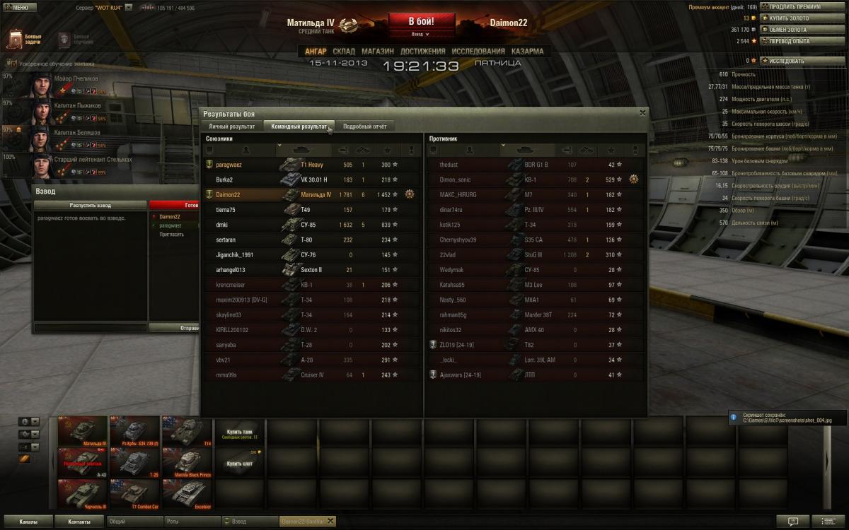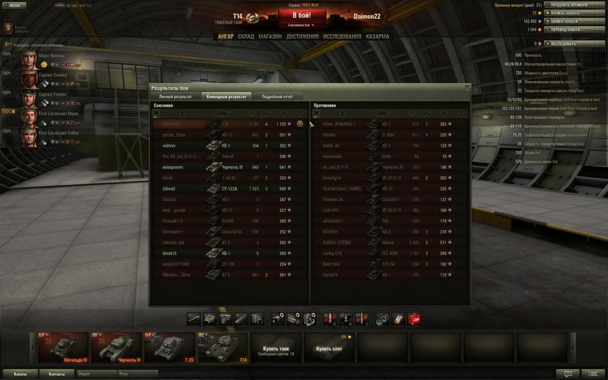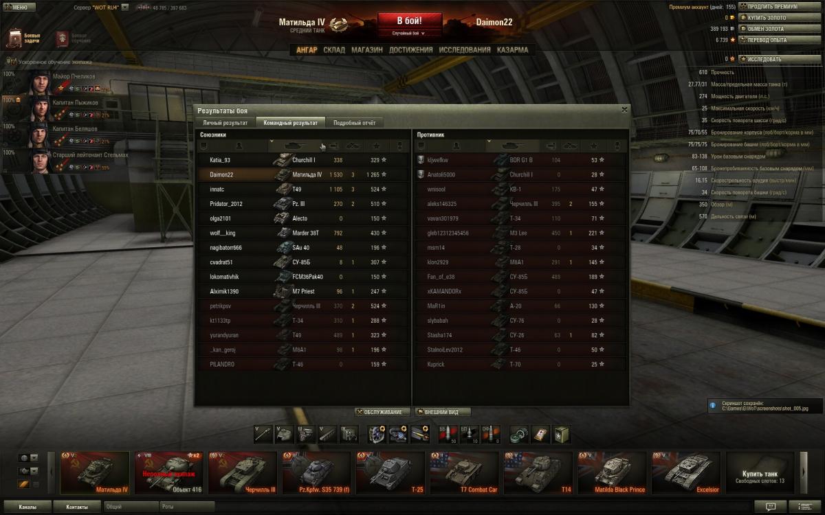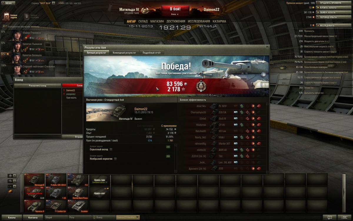 Нет друг мой,дело не во взводе,дело в умениях экипажа,голде и немного везения просто.Обрати внимание сколько у меня боев на пятачках и кто там сидит в целом.Я сам не активный взводный,попросят сыграть со мной помогу конечна.Фишка Матильды это в основном полузащитник,лезть на кв-1 и черта не надо,увидел сразу ушел в сторону от них"Всему Свое Время"у Матильды одна проблема скорость неповоротливая чутка.То есть какой момент для нее сначала в защите играешь активна и не кустовая защита,а именно туда-сюда гоняешь потихоньку фраги рубишь,только численный перевес когда будет на стороне твоей команды,тогда да уже атака и контратака.То есть посильная помощь союзам,своей команде и самому себе,никаких надуваний щек в стиле счас я им покажу.Я вот сам сколько раз показывал,только вот поражения почему-та получал.Упор поначалу ставить надо на обзор и скрытность если экипаж слабоват,да пусть и стреляет редко и сводиться долго,но на слабом экипаже ты и не Бог.Потом уже да когда 4-5 умений буит можна рискнуть на кв-1 и черта выезжать внаглую глушить их.