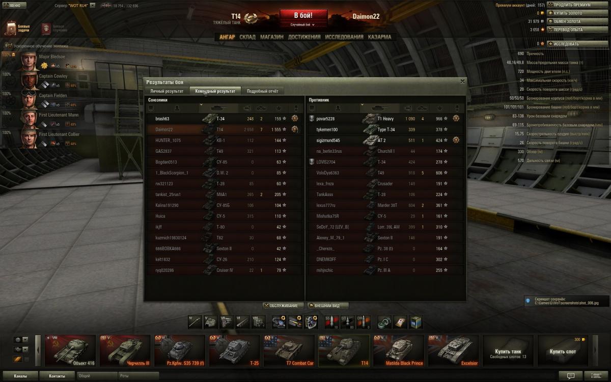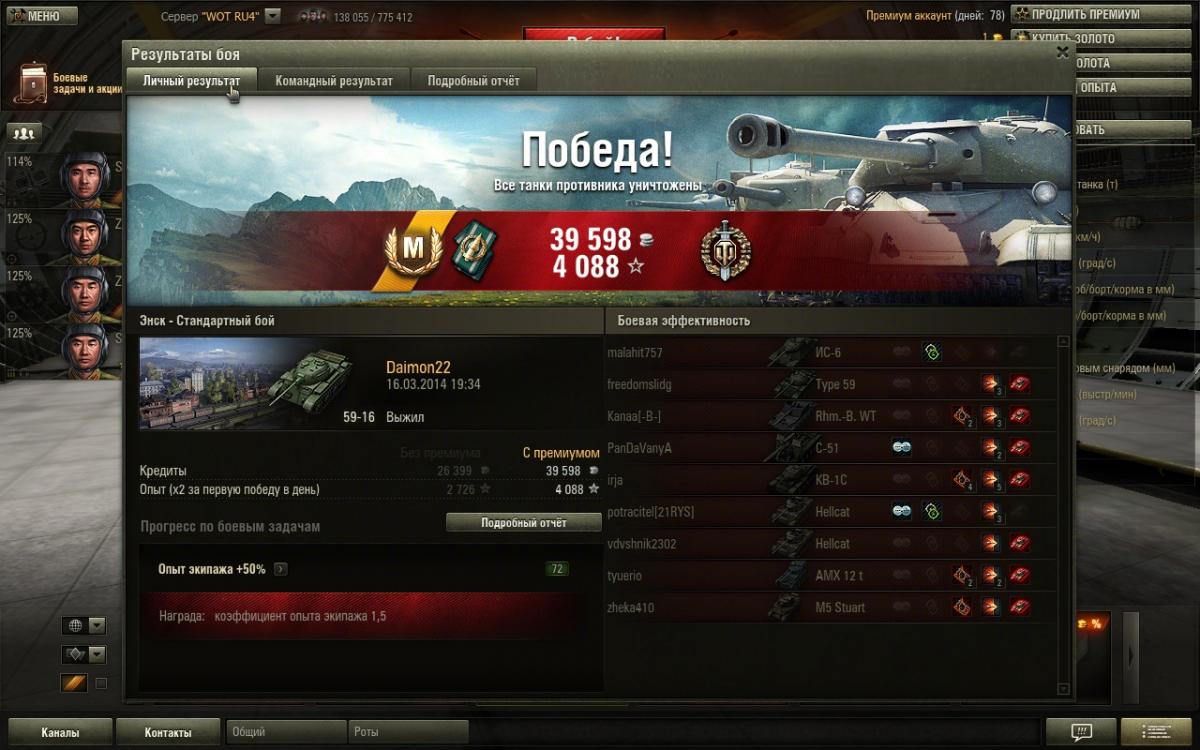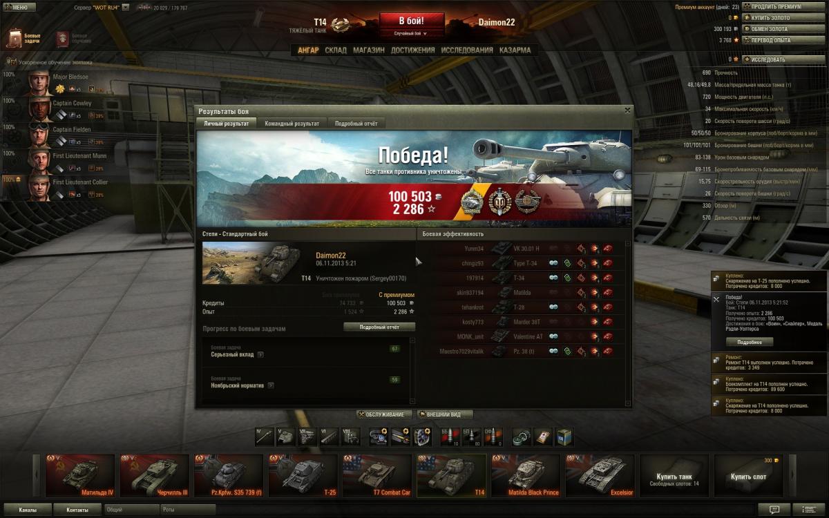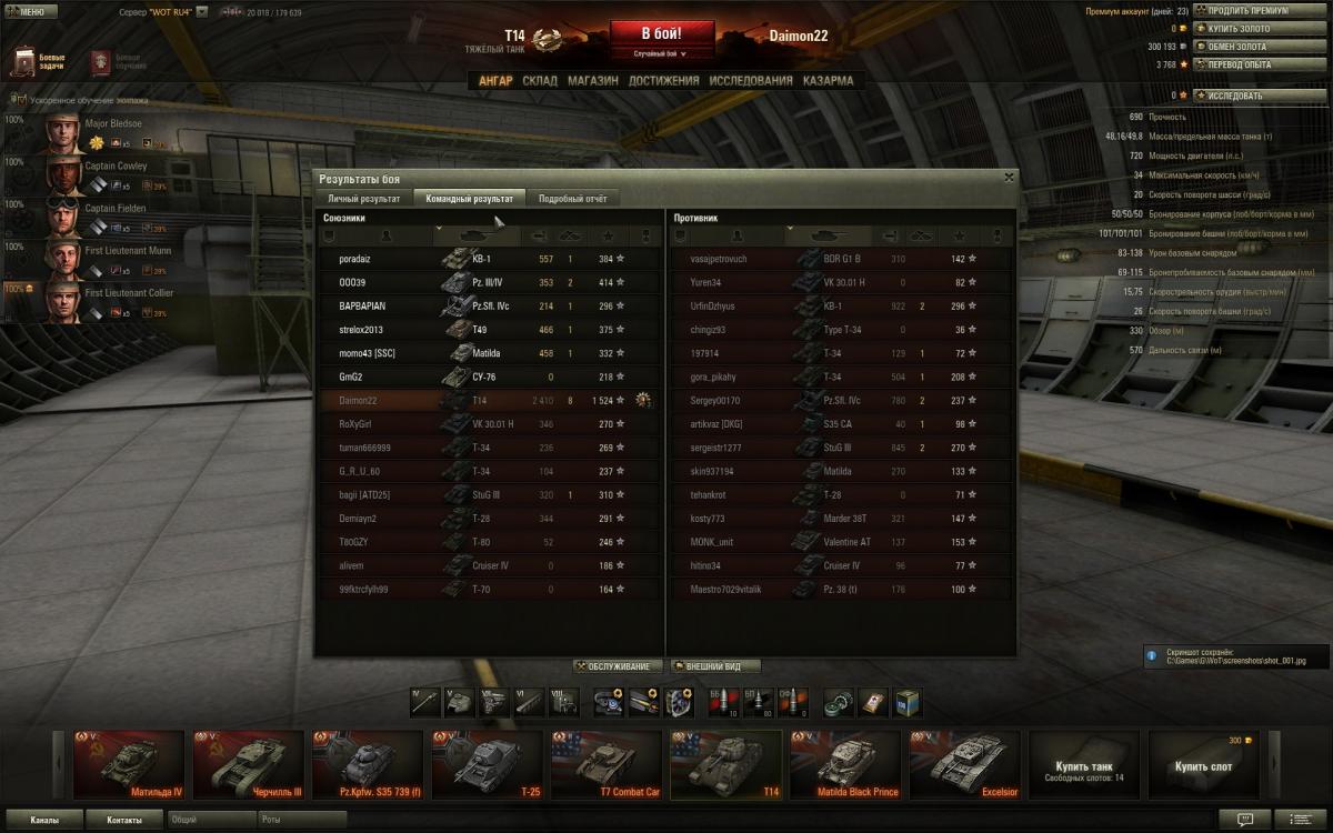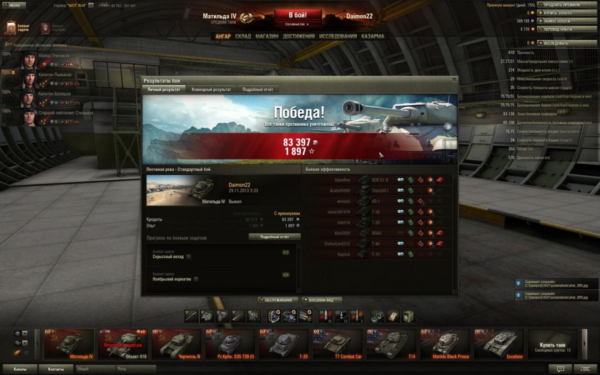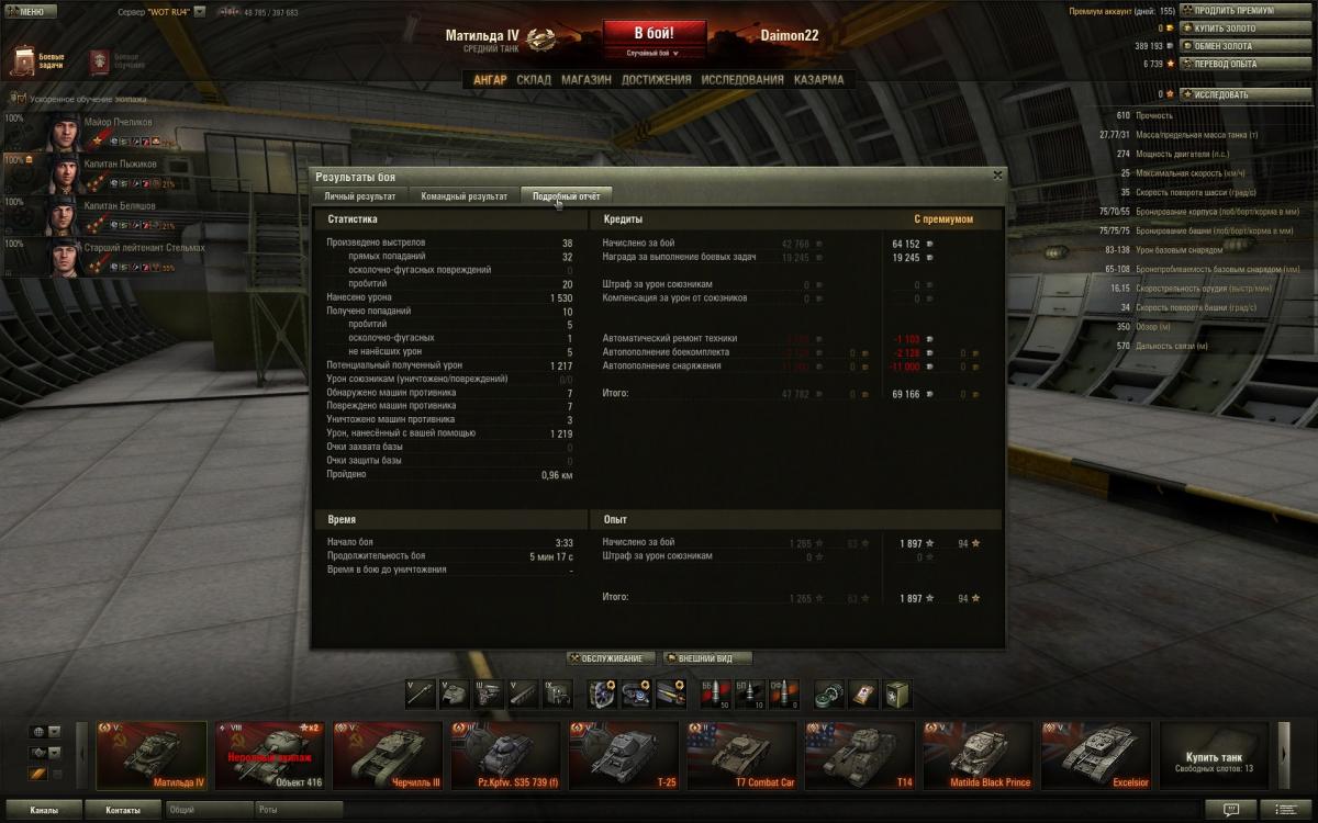 Нет друг мой,дело не во взводе,дело в умениях экипажа,голде и немного везения просто.Обрати внимание сколько у меня боев на пятачках и кто там сидит в целом.Я сам не активный взводный,попросят сыграть со мной помогу конечна.Фишка Матильды это в основном полузащитник,лезть на кв-1 и черта не надо,увидел сразу ушел в сторону от них"Всему Свое Время"у Матильды одна проблема скорость неповоротливая чутка.То есть какой момент для нее сначала в защите играешь активна и не кустовая защита,а именно туда-сюда гоняешь потихоньку фраги рубишь,только численный перевес когда будет на стороне твоей команды,тогда да уже атака и контратака.То есть посильная помощь союзам,своей команде и самому себе,никаких надуваний щек в стиле счас я им покажу.Я вот сам сколько раз показывал,только вот поражения почему-та получал.Упор поначалу ставить надо на обзор и скрытность если экипаж слабоват,да пусть и стреляет редко и сводиться долго,но на слабом экипаже ты и не Бог.Потом уже да когда 4-5 умений буит можна рискнуть на кв-1 и черта выезжать внаглую глушить их.
