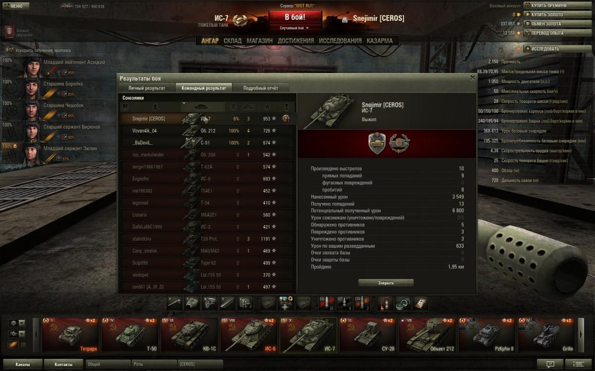 Да нет у него брони больше. Вот у меня ИС-6, вот у него броня как броня. 101 стена при 1500 боях. Т.е. каждые 15 боев. А у феди сопли какие-то. Что удивительно - 200 мм! (хотя только местами). Так у меня на феде 1 стена! Вот у тебя много стальных стен на феде? Я спрашиваю про стены, потому что это показатель бронированости. В рандоме ЛЮБОЙ танк в состоянии пробить федю. (начиная с Т-50 голдой в борт) И нечего оправдывать это фуфло ) Хотя конечно можо приспособится к феде нагибадь, благо есть орудие. Хотя точность этой пушки сильно преувеличивают. Рабочая дистанция 350 метров. Это конечно не плохо, но с 500 на ход ИСам не накинешь.